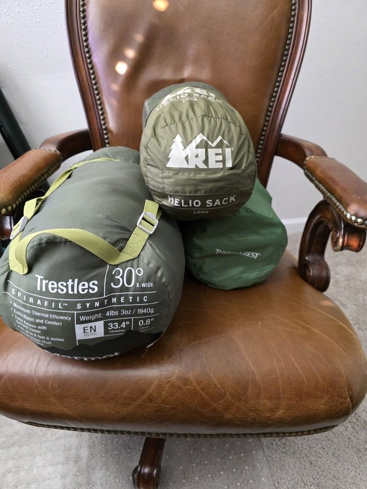 Comes with a NEMO Galaxi 2P backpacking tent (paid $300 new) maybe used 5 times. Coyote brown in color. Rainfly seals need to be re-sealed, very easy to do. Also comes with a Marmot 30° sleeping bag, a Thermarest sleeping pad and an REI Helio Sack (bivy sack) Everything is in great condition. $200 obo