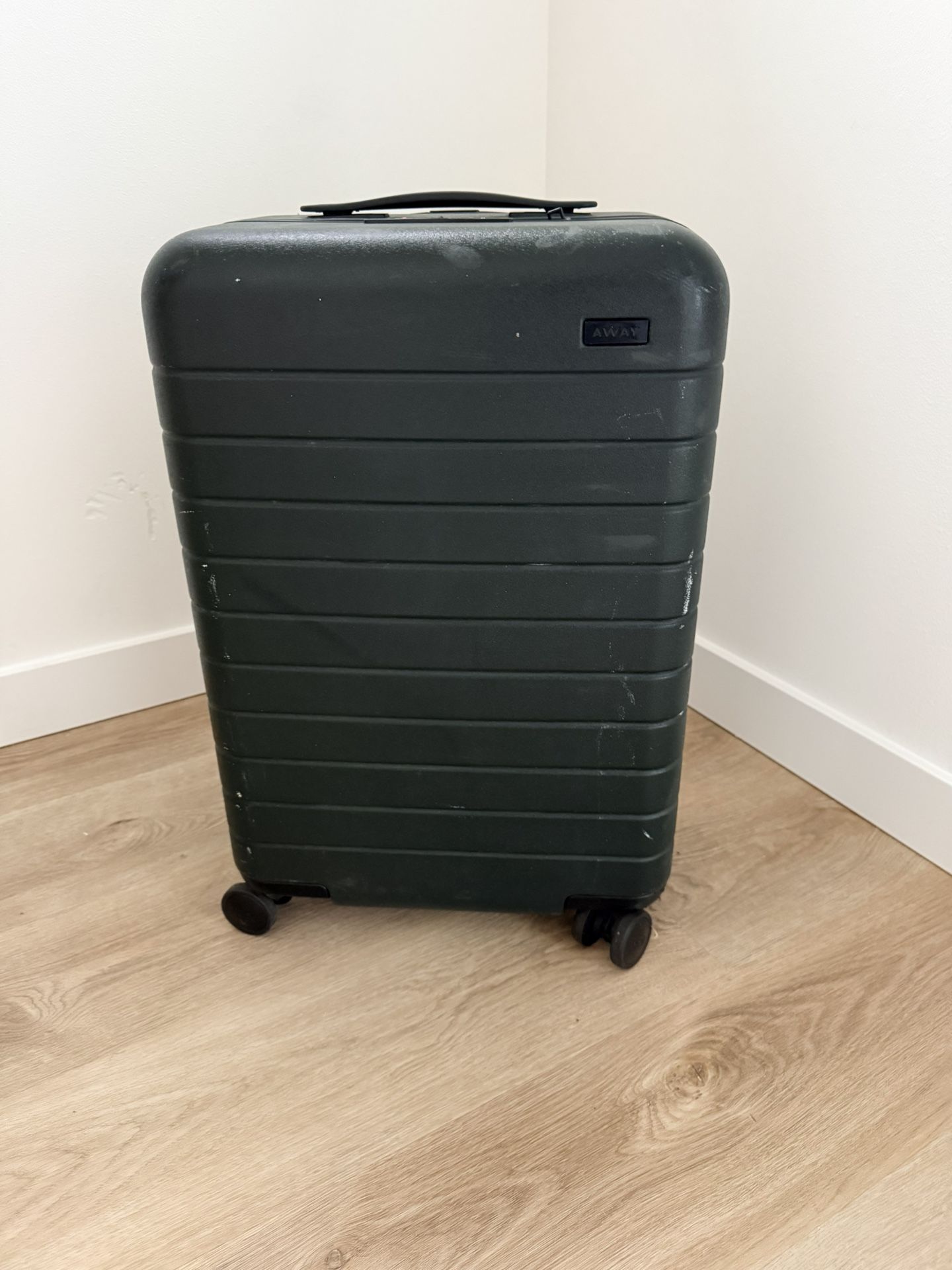 Good condition suitcase. Used, and has been checked which is where the white scuffs and dent on the corner come from. The white scuffs should come off with a magic eraser per Away’s instructions. All clasps, zippers, and locks work just like they did new.
