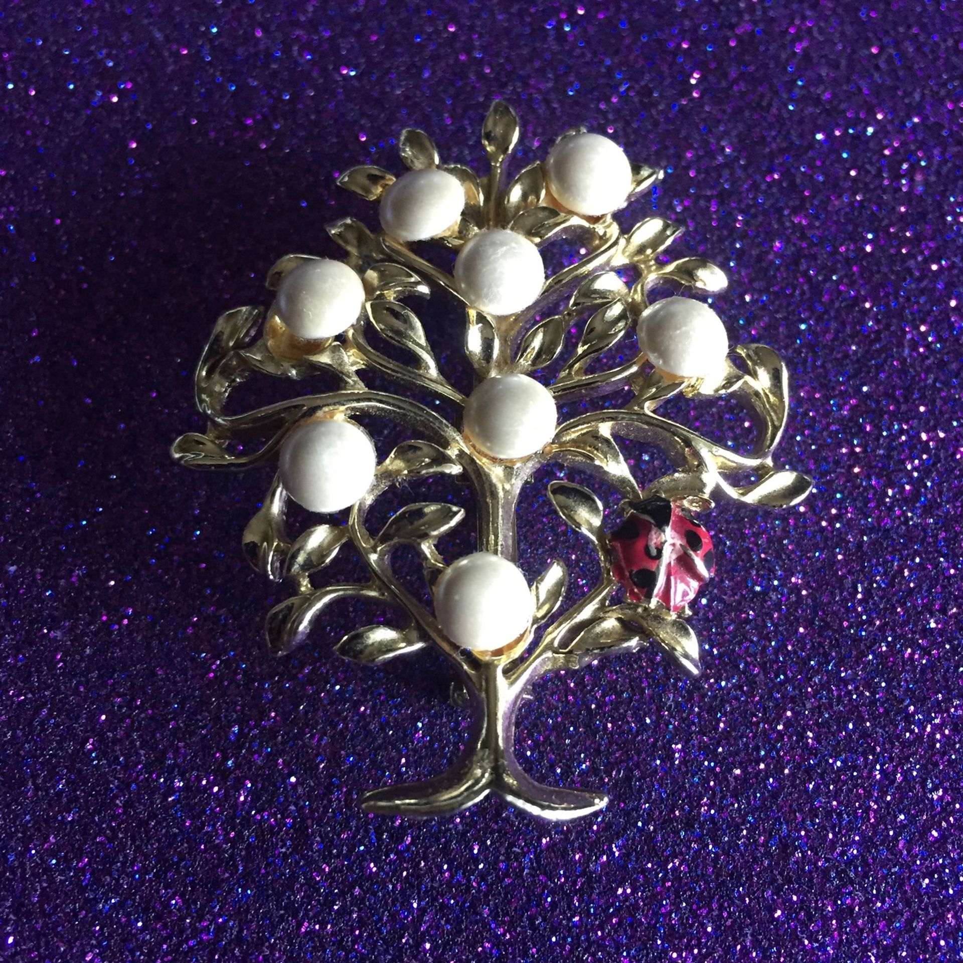 Stunning Vintage gold tone Tree brooch with 8 pearls and ladybug Excellent conditions. Thanks for visit my shop.