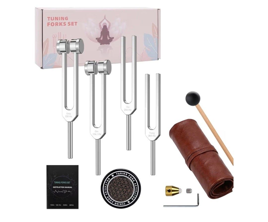 Tuning Forks for Healing Set, 128Hz 136.1Hz OM 256Hz 384Hz, Aluminum Alloy Sound Therapy Kit for Meditation, Yoga, Chakra Balancing and Reiki, Includes Mallet, Activator and Pouch Brand New in Box