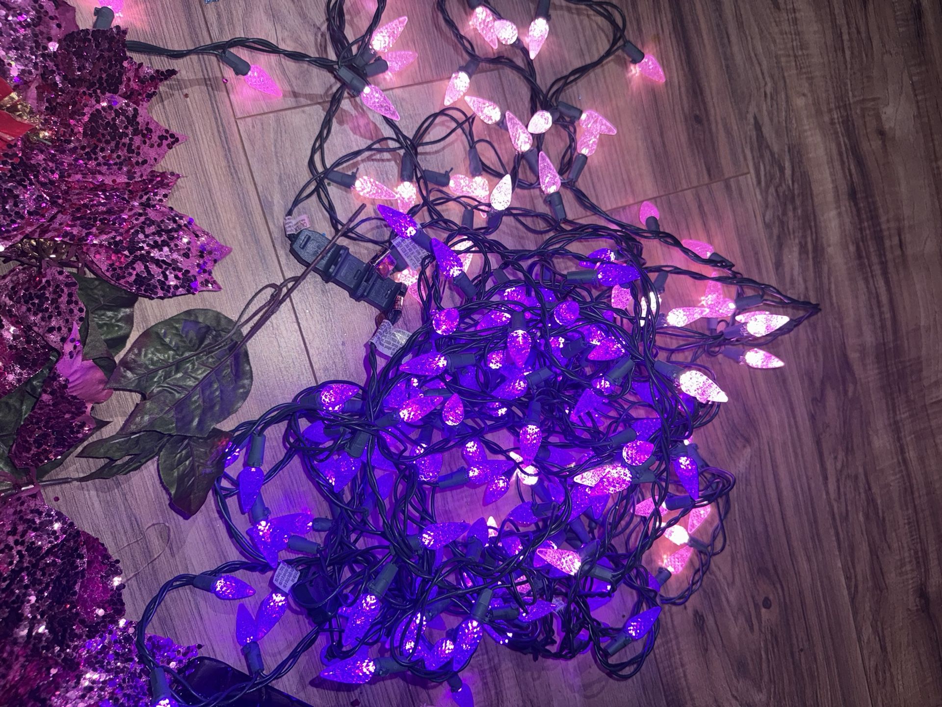 There is pink and purple lights (picture didn’t come out great to show the color), pink and green glitter flowers, multi colored bulbs. These all look great together and all lights work. Asking $30obo for everything