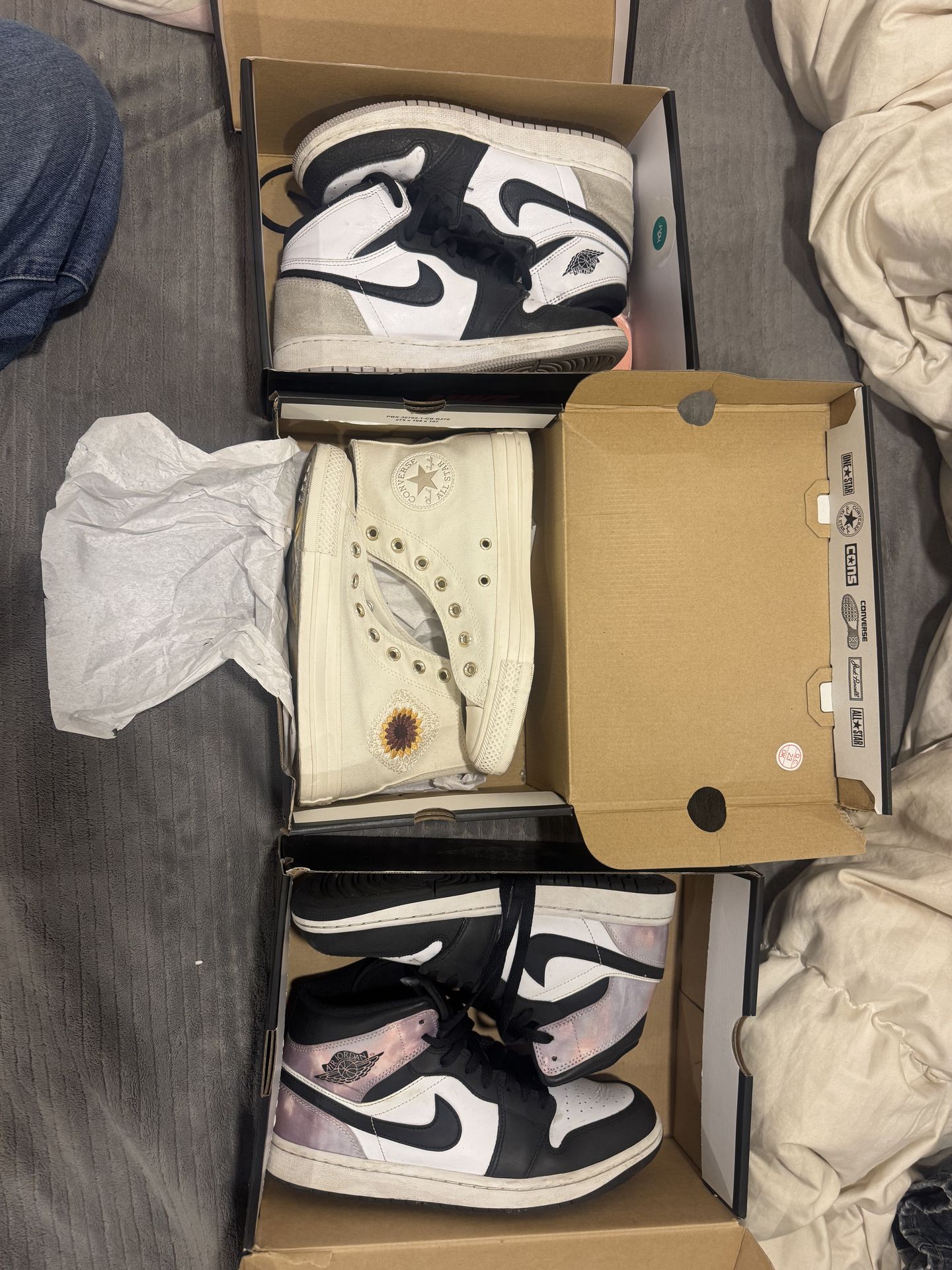 Converse are women’s 7 and don’t have shoe laces (but I have extra new white ones), gray Adida are 7 women, and the galaxy jordan’s are 10 in men. Message me if interested and if you only want one pair.