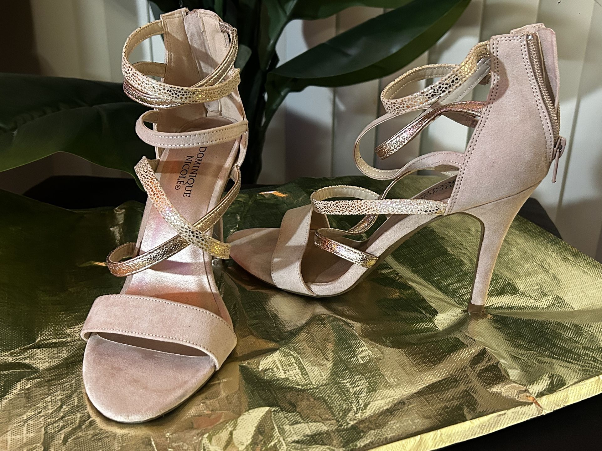 Strappy rose gold heel with snake skin pattern