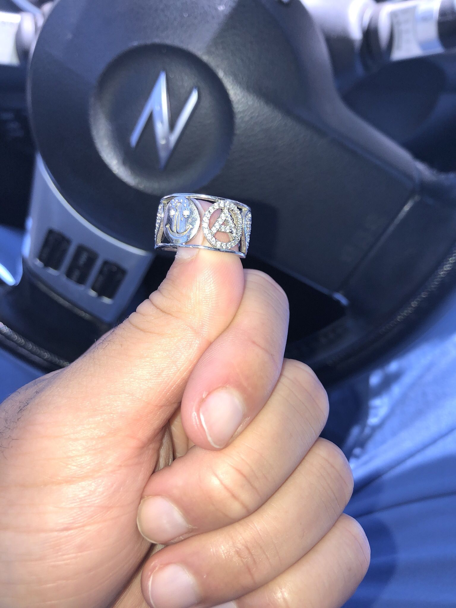 Absent USA .925 Stainless steel Silver ring with cz diamonds from spring/fall season 2021. Truly unique piece, Won’t find anywhere on the internet so I know it’s going to sell fast. Only defects is one heart is missing one gem out of it and also the shape is a little bent on bottom but not noticeable while wearing.