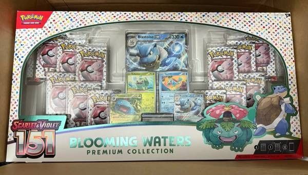 The "Pokemon 151 Blooming Waters Premium Collection" is a box set from the "Scarlet & Violet" set of the Pokémon TCG. It features the character Blastoise and includes • 4 foil cards featuring Venusaur ex, Blastoise ex, Bulbasaur, and Squirte • 1 oversize foil card featuring Blastoise ex • 12 Pokémon TCG booster packs • A code card for Pokémon TCG Live cash only, I have more than 1