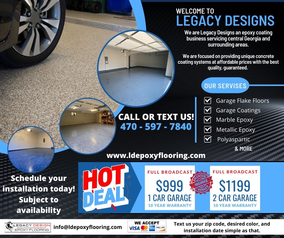 Full broadcast system Promotion info on flyer. Concrete coating Garage color chips flakes Flooring Epoxy resin Stain and seal system And more