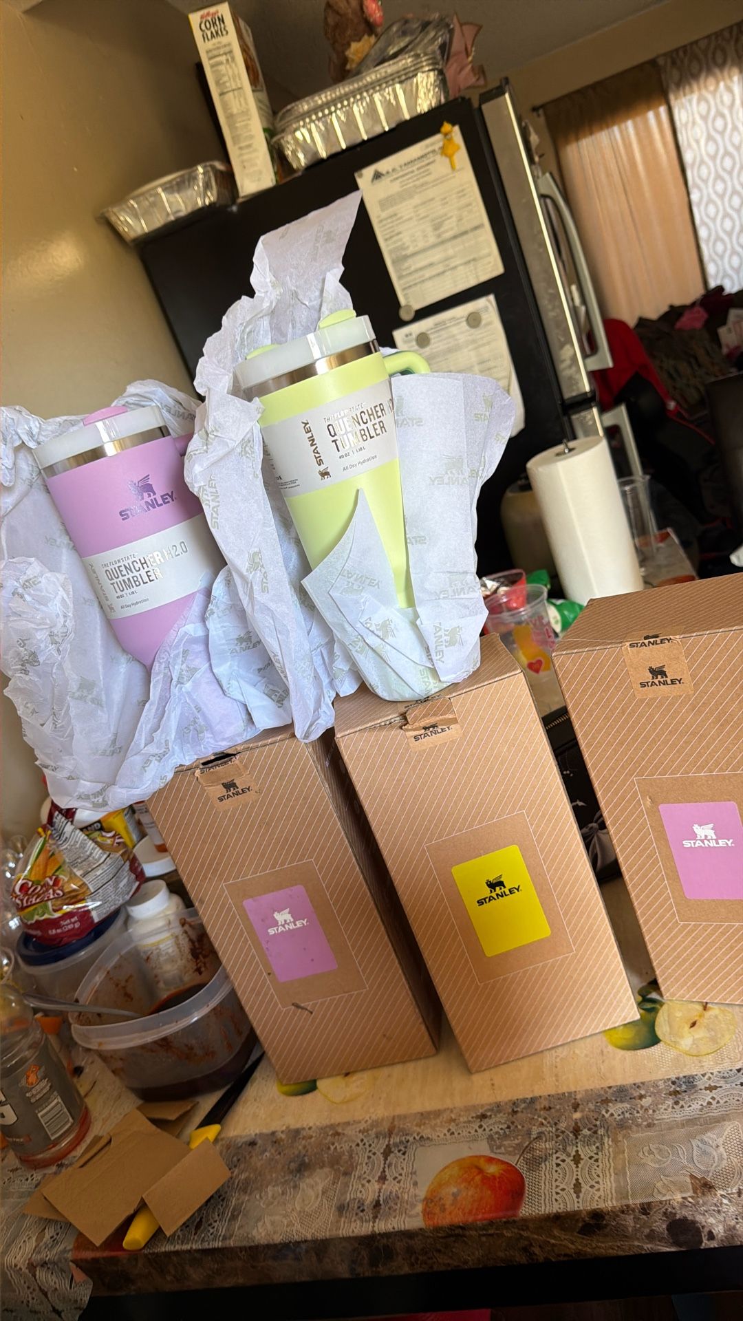 I have three brand new 40 ounce Stanley tumblers. I have two purples and one light green $50 each or all three for 125.