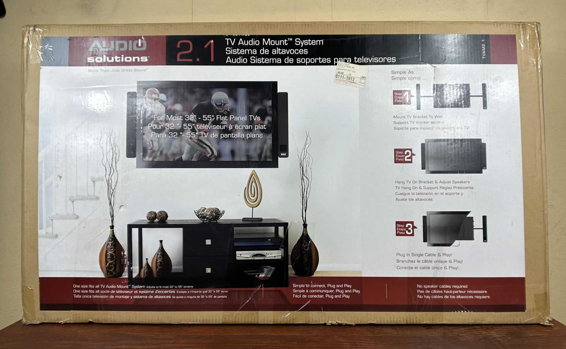 Brand new in box and 100% complete! This is the ultimate "clean setup" solution for your home theater. The Audio Solutions TVAM2.1 is a heavy-duty TV wall mount with a high-end 2.1 audio system built right into the frame. Why this is better than a standard mount: • Built-in Pro Audio: Includes two side speakers (silk dome tweeters) and a built-in 6.5" powered subwoofer for deep bass. • No Clutter: Replaces the need for a bulky soundbar and a separate subwoofer sitting on the floor. • High Power: Built-in 100W Max Class D amplifier provides room-filling sound. • Compatibility: Fits most 32" to 55" flat-panel TVs (up to 133 lbs). • Adjustable: Features a 15-degree tilt and swivel to get the perfect viewing/listening angle. Brand New in Box (Open box only to verify contents). All mounting hardware, cables, and remote control are included. Retails for much more – asking $150 OBO. Available for pickup in Pomona.