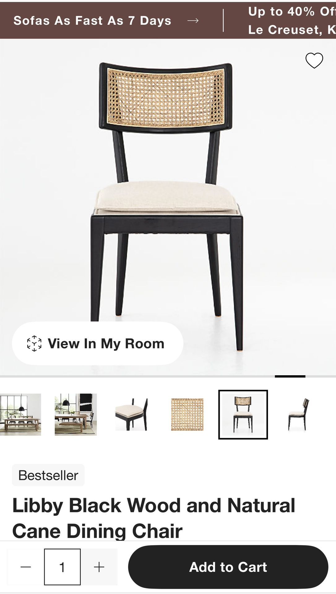 6- matching dining room chairs. Crate and Barrel Libby black wood and natural dining room chairs. In perfect condition. Dining table not included. Set of 6- $900.00