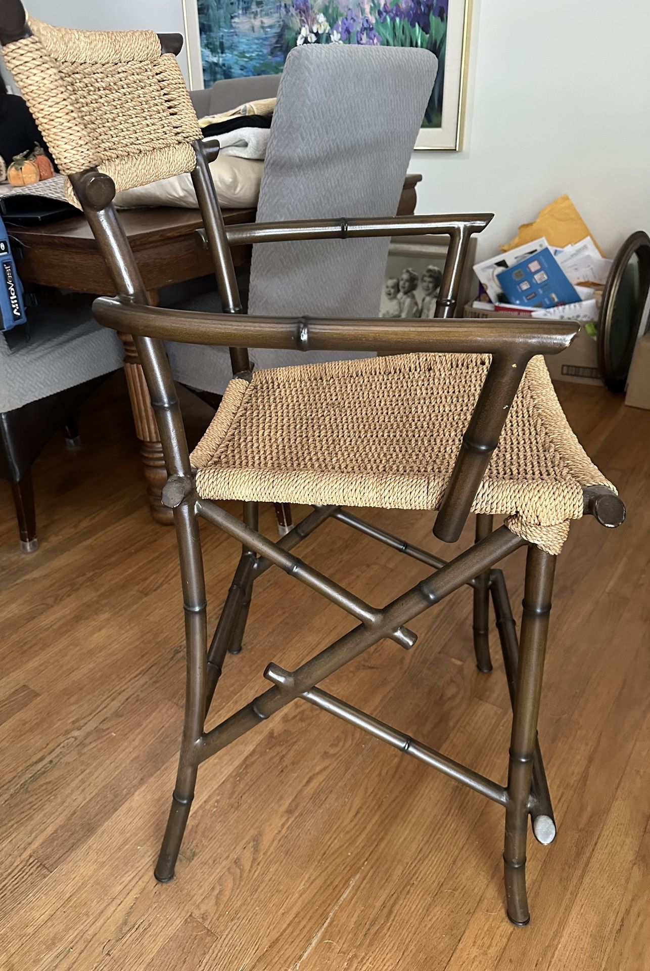 Pair of faux bamboo metal director’s bar stools with woven wicker seats — coastal boho style.
