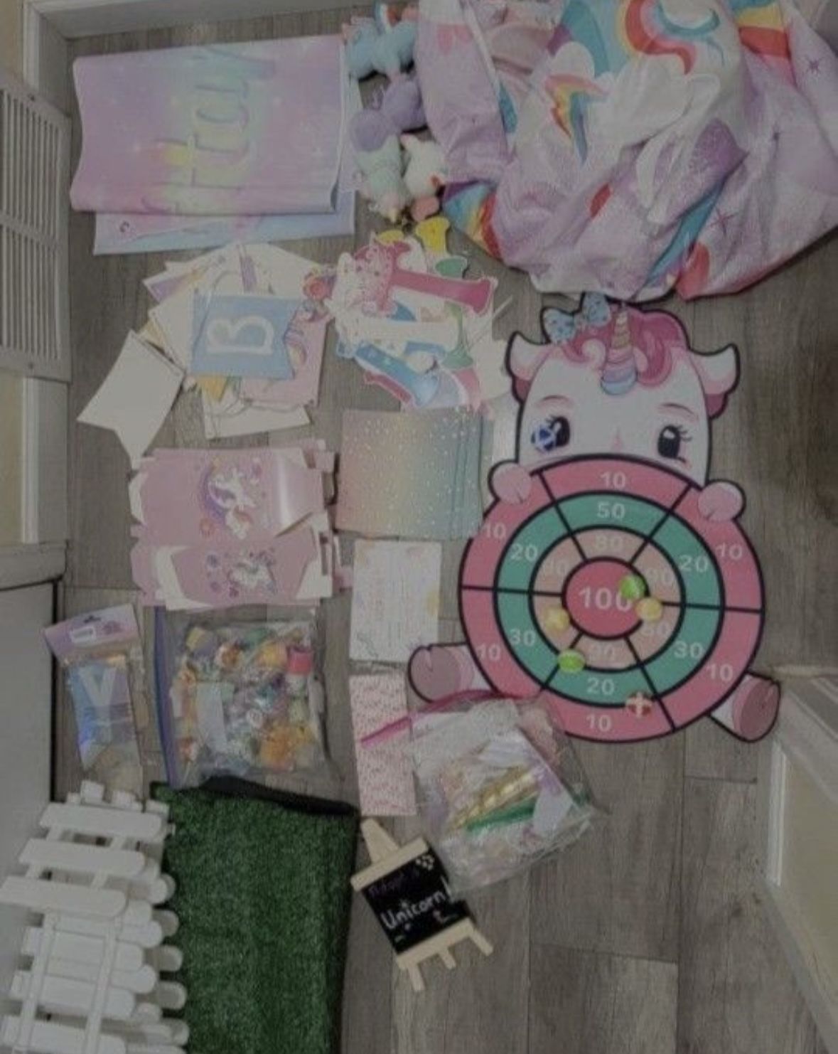 Includes adopt a unicorn set up (adoption papers, grass, fence, plush unicorns, sign, take home boxes), 3 Happy Birthday String Banner, 1 cloth Happy Birthday Banner, a huge bag of lots of misc items for gift bags (stickers, rings, key chains, etc.), unicorn ball toss game, unicorn cake topper, unicorn cupcake toppers, napkins, NEW straws, and unicorn bed sheet. Great deal! Cash only.