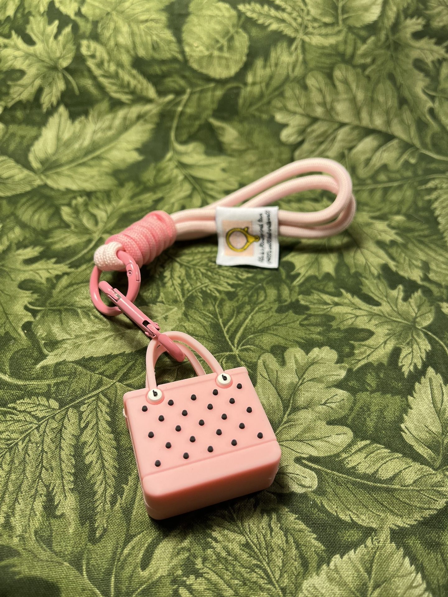 This mini hole bag keychain is perfect for those who love spending time at the beach to hook keys or other items. The pink color and beach theme make it a great accessory for any beach bag, purse, or backpack. It features a trigger clip for easy attachment and is made of rubber material. This keychain is a great addition to any collection or as a gift for those who love the beach. •• Total Length is 10 inches •• Pink and Light Pink Paracord Roping Measures Approx 5 inches •• Two Pink Hooks •• Solid Pink Bag Charm Measurements Approx 1 3/8 inches x 1 5/8 inches x 3/4 inches •• Nice Gift Box with Ribbon is Included •• Non Smoking Home