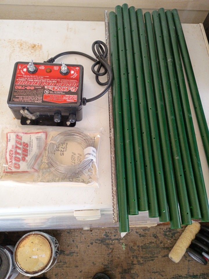It comes with (1) rebar , 7 plastic tubes, a roll of wire, 2 fuses and electric box Still brand new hasn't been used The box is all frail from rain