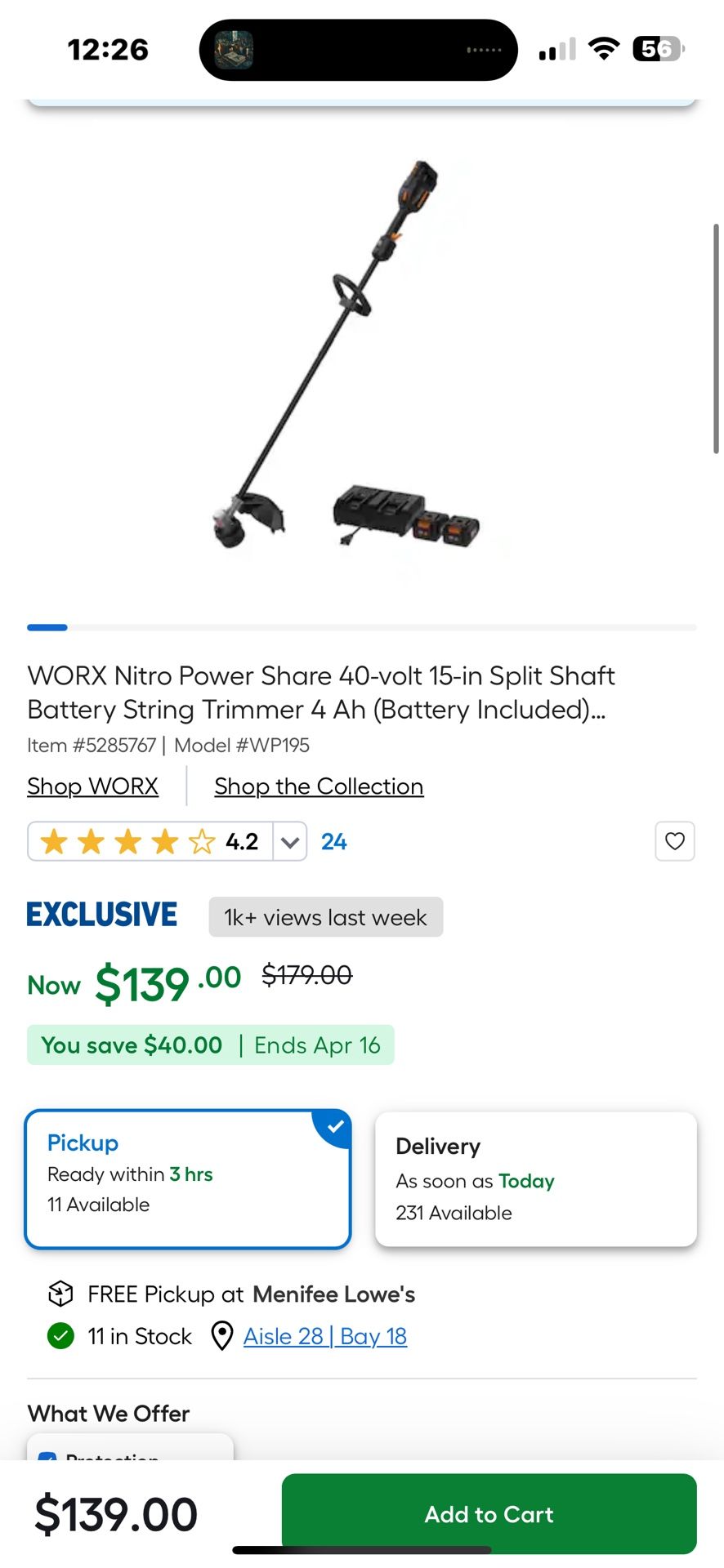 Only used a few times before deciding to get artificial turf. The Worx Nitro 40V 15” Cordless String Trimmer offers pro-grade performance to support a variety of grass trimming tasks—such as cleaning up sidewalk, driveway, and retaining wall areas. The high-efficiency brushless motor runs 50% longer, is 25% more powerful, and delivers a 10X longer life than trimmers with a standard brush motor. With this added power, the 15” dual-exit cutting head makes trimming effortless—even in dense, overgrown areas. The 15” cutting diameter optimizes coverage to help save time and effort on expansive landscaping tasks. Use the bump-feed system to advance trimmer line with a simple tap on the ground, giving you tighter control over how much line you use. Find the right speed for your specific trimming task using the variable speed control, conveniently located on the handle for easy adjustment. For lighter tasks, switch to ECO mode to conserve battery power and extend run time. And with the easy-read charge level indicator, you can quickly see how much battery power is left and determine when it’s time to recharge. The 40V 15” String Trimmer uses an easy-load spool head—a new addition to the Worx product line that stays on the tool for simpler trimmer line replacement. This spool fits standard-sized 0.095” trimmer line, which can be purchased directly through Worx. THE POWER TO OUTPERFORM - Worx NITRO™ tools are engineered to provide greater power, performance, and run time HIGH-EFFICIENCY BRUSHLESS MOTOR - Runs 50% longer, is 25% more powerful, and has a 10X longer life than tools with brushed motors CARBON FIBER - Lightweight carbon fiber shaft for ease of use and less fatigue SAME BATTERY, EXPANDABLE POWER - The same battery powers over 75+ 20V, 40V, and 80V lifestyle, garden, and power tools in the Power Share family VARIABLE SPEED CONTROL WITH ECO MODE - Adjusts trimming pace to fit specific application needs, so switch to ECO mode to save battery power and extend run time BUMP-FEED LINE ADVANCEMENT - Advances line with a tap on the ground to give you more control over how much trimmer line you use