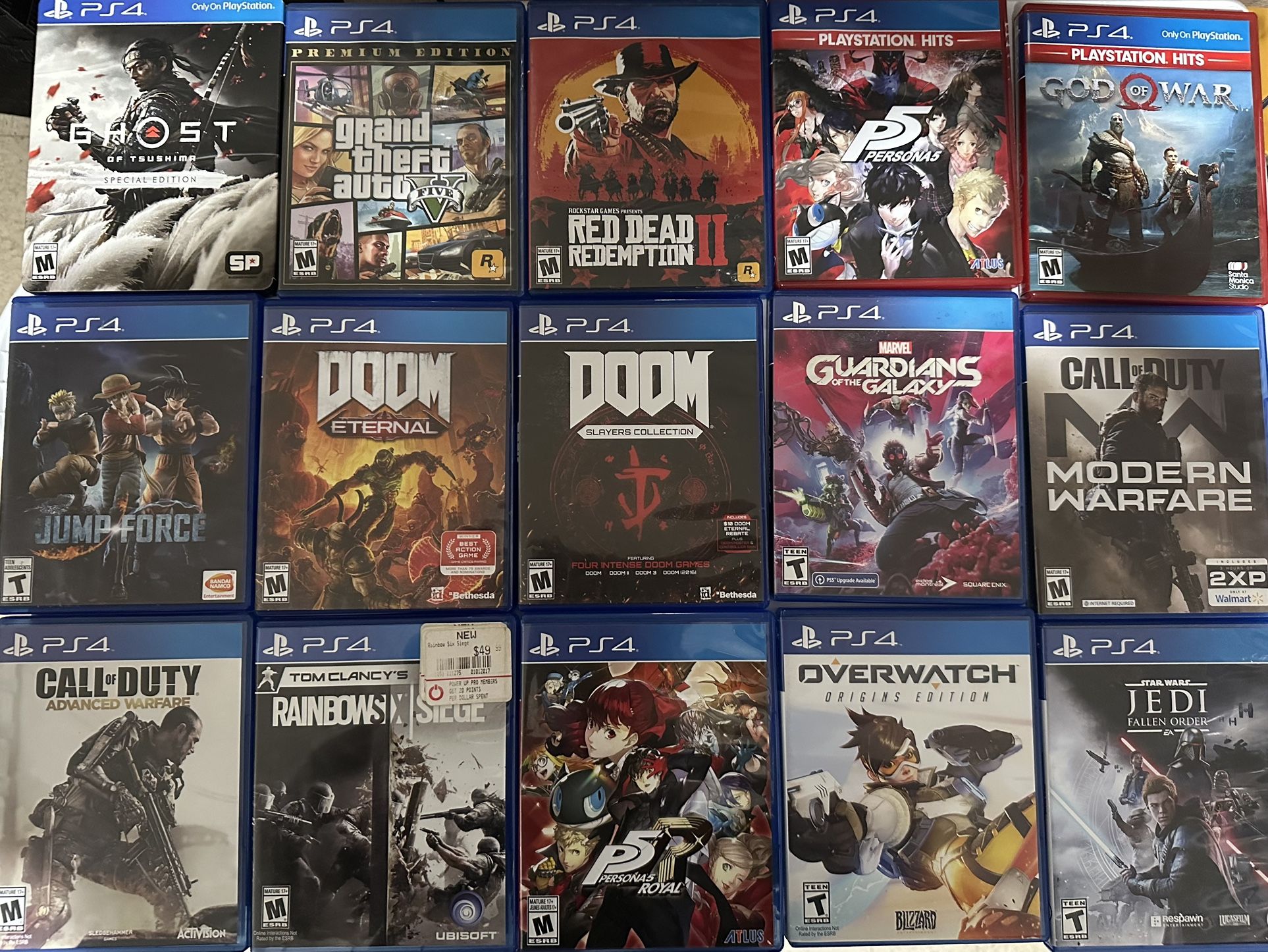 PS4 Games for sale Will trade for Nintendo Switch games Pickup in Madera Ghost of Tsushima (comes w steelbook) $15 GTA V $10 Red Dead Redemption 2 $10 Persona 5 $8 God of War $8 Jump Force $10 Doom Eternal $10 Doom Slayers Collection $10 Guardians of the Galaxy $8 Call of Duty Modern Warfare $8 Call of Duty Advanced Warfare $8 Rainbow 6 Siege $8 Person 5 Royal $15 Overwatch $5 Star Wars Jedi Fallen Order $7 Final Fantasy XV Deluxe Edition + steelbook $15 It Takes Two $20 Borderlands The Handsome Collection $5 Spider-Man $10 Spider-Man: Miles Morales $12 Elden Ring $20 Kingdom Hearts III $8 Minecraft $15 Monster Hunter World: Iceborn $15 Cyberpunk $13
