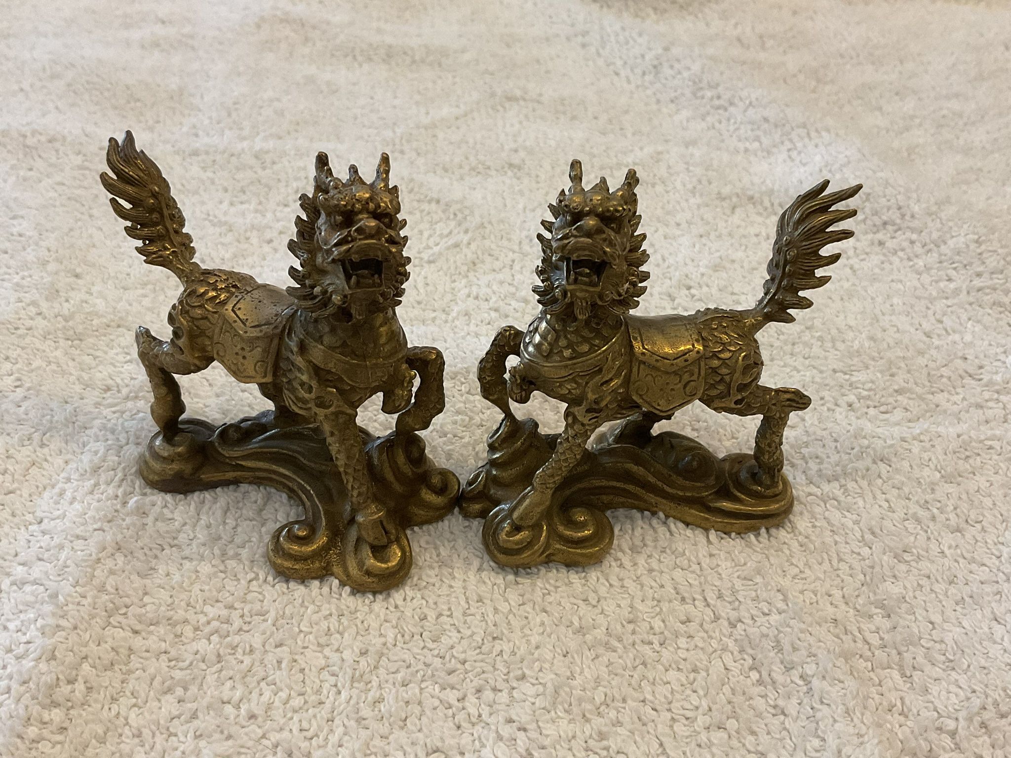 These are a pair of mythical Antique Chinese Bronze Dragons. Kylin Kirin Kilin Chi-Lin Beast Statue Pair. Price is for the pair.