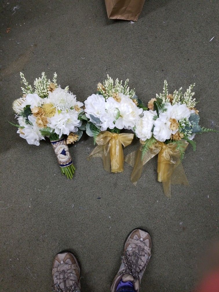 3 bouquets total. One for the bride, and two bridesmaids. And almost enough extra to make a full fourth. The only thing missing for a full 4th is some filler white flowers from Michaels. I can help you find the right ones. I can also show how to make matching boutonnieres for the groomsmen.