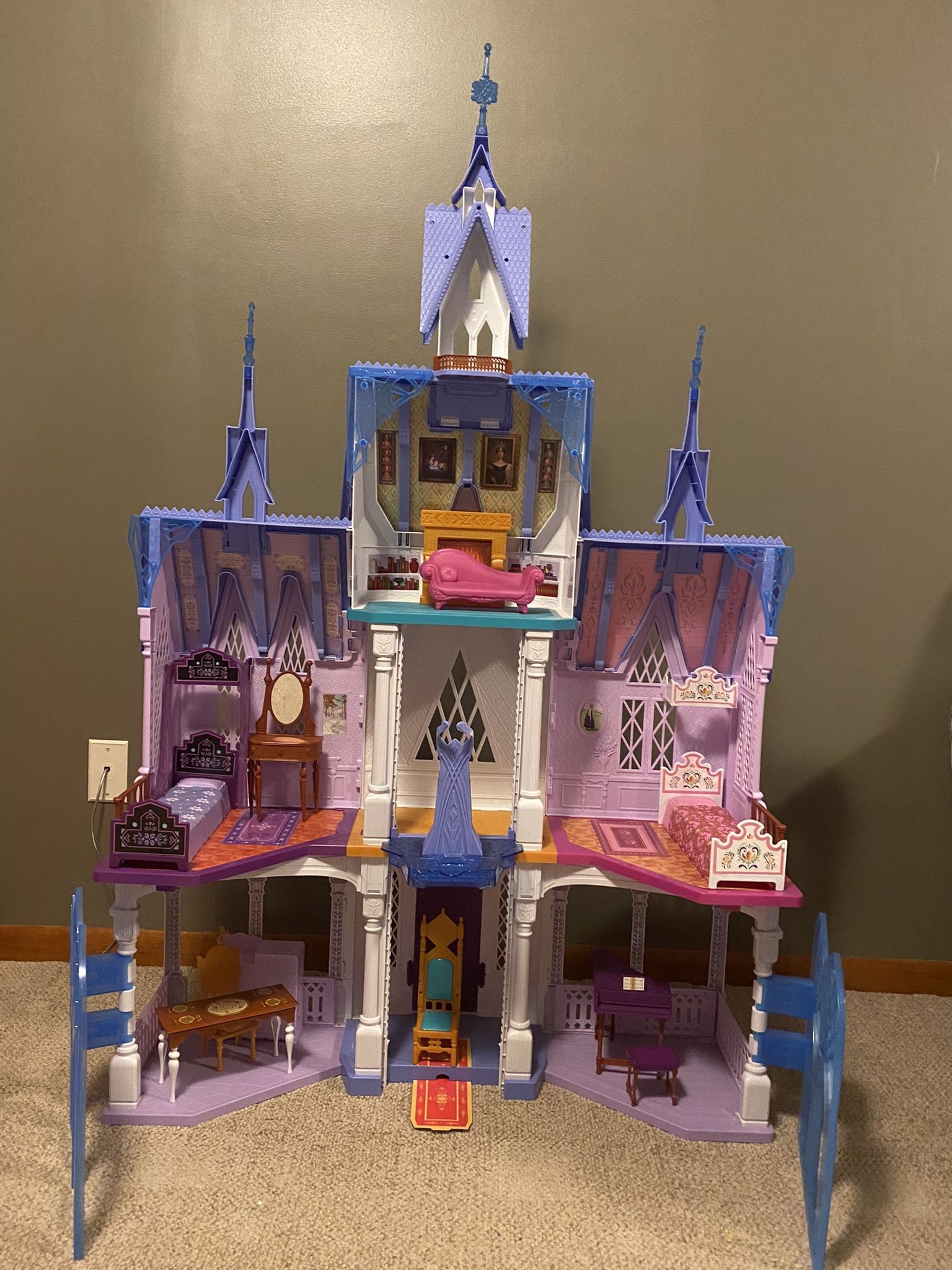 Like new a frozen 2 Castle. As far as I can tell only the pink curtain is missing .