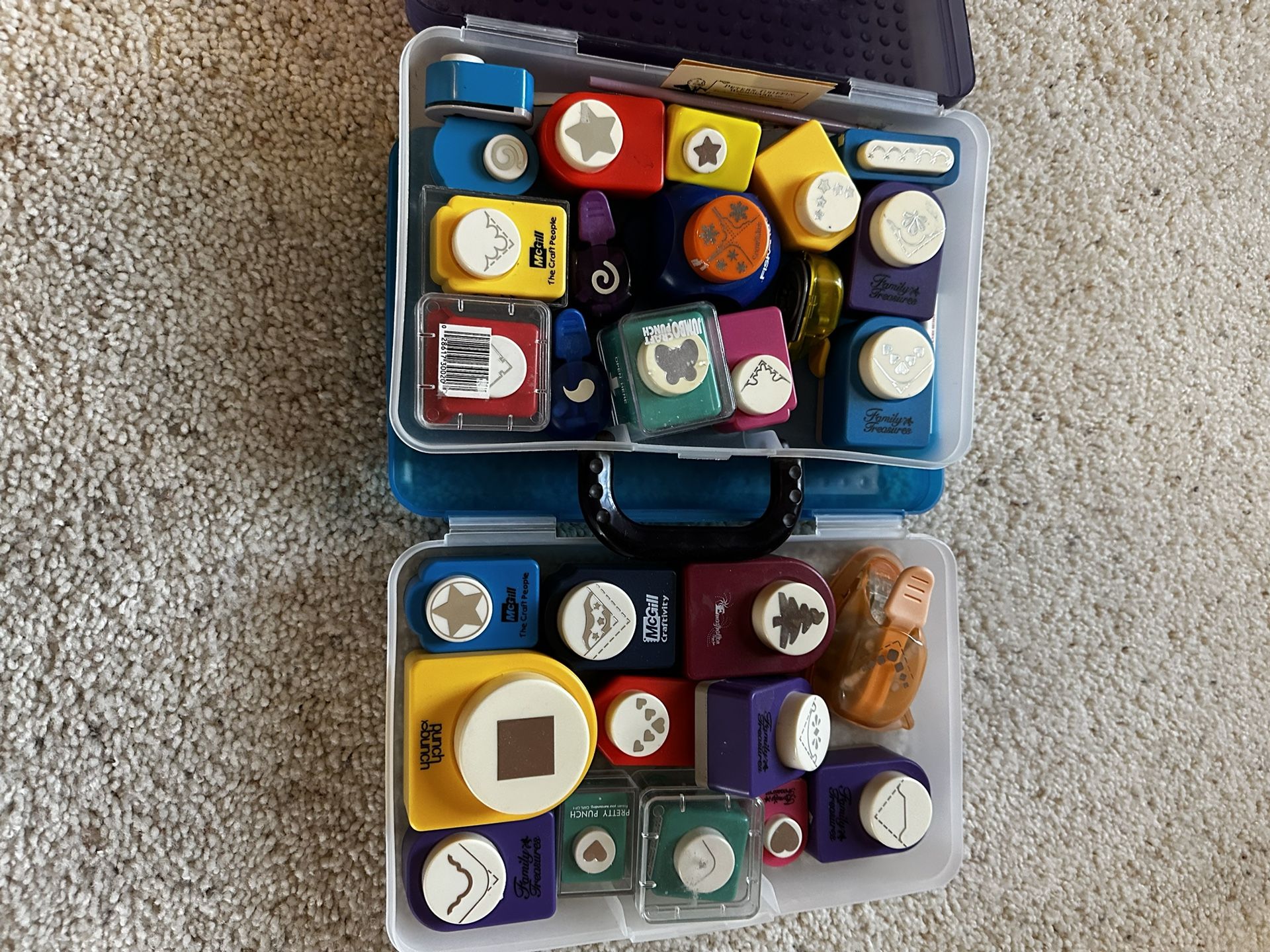 Craft paper punch sets. Over 25 unique punch cut-out shapes.Some are “Family Treasure” brand. Various sizes. Must take entire collection.