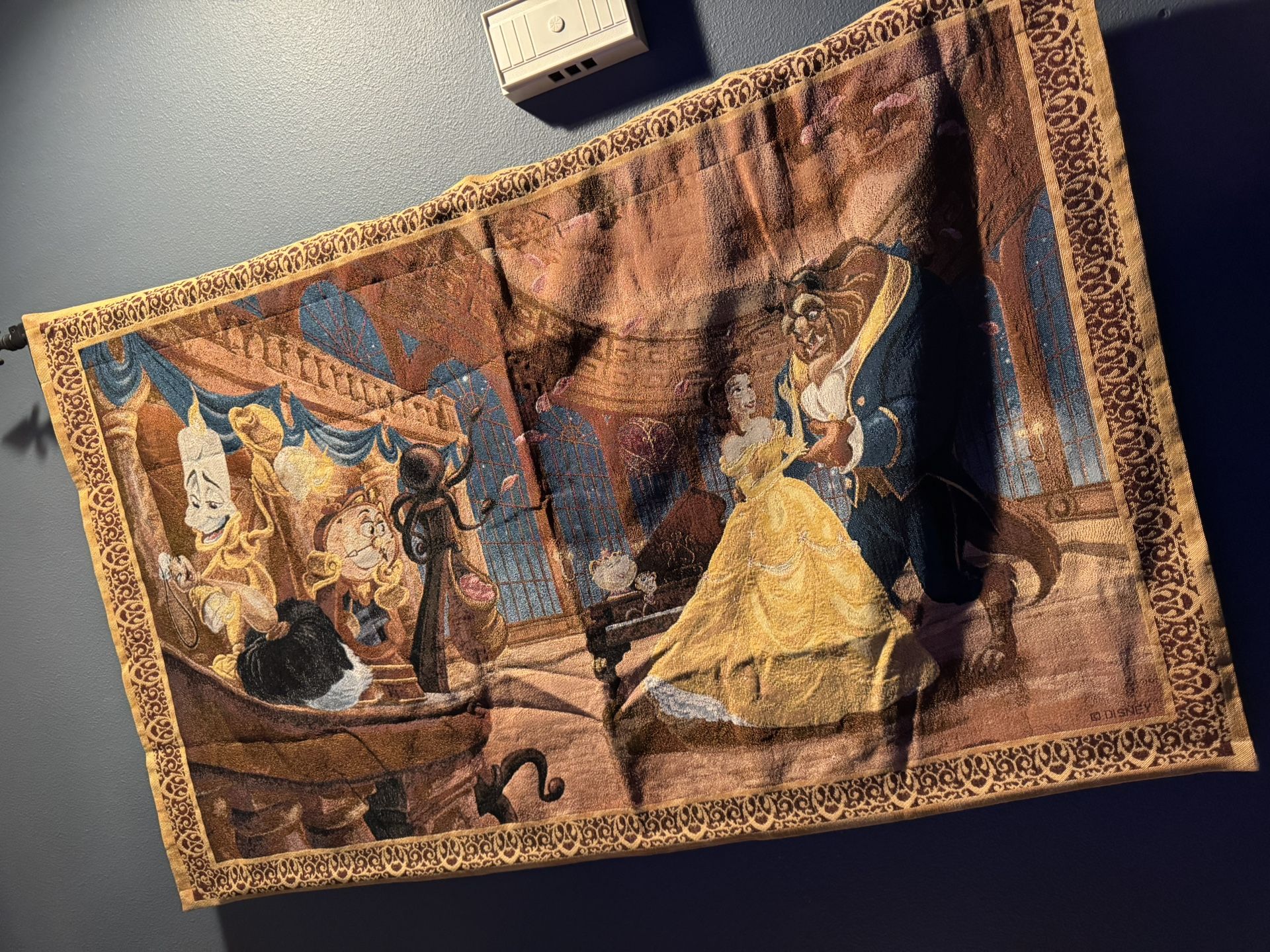 Add a touch of Disney magic to your home with this beautiful tapestry featuring Belle and the Beast from the classic animated film. The multicolor design is perfect for any room in your home, from the office to the living room, and will make a great gift for any fan of the movie. The tapestry is made from high-quality materials and is designed to last for years to come.This wall hanging decoration is perfect for adding a touch of whimsy to your home décor, and the characters are sure to bring a smile to your face every time you see them. Whether you're a collector of Disney memorabilia or just looking for a unique piece of wall art, this Beauty and the Beast tapestry is sure to impress. Like new condition. 33inches x 56 inches.