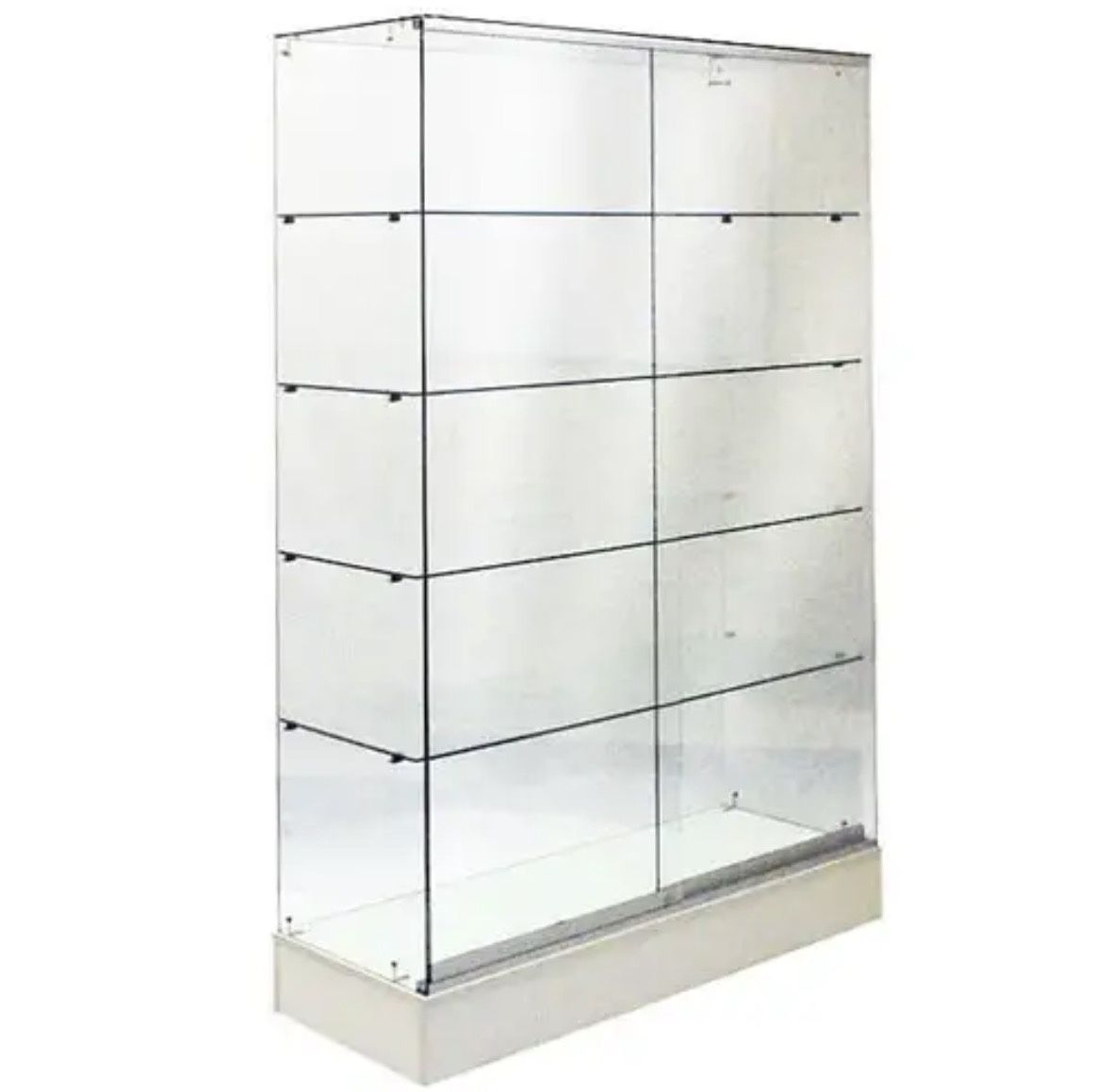 18"D x 48"W x 72"H. 1/4" tempered safety glass and 4 15"D shelves included.