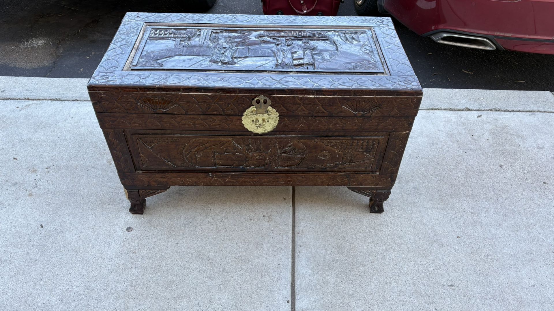Solid wood storage chest with hand-carved artwork on front panels. Dark stained finish. Raised relief scenes with decorative border carving. Sturdy build. Hinged top opens for storage. Short carved legs. Unique vintage look. Condition Used. Normal wear from age. No major damage. See photos. Size Approximate. Medium to large chest. Fits blankets, tools, or keepsakes.