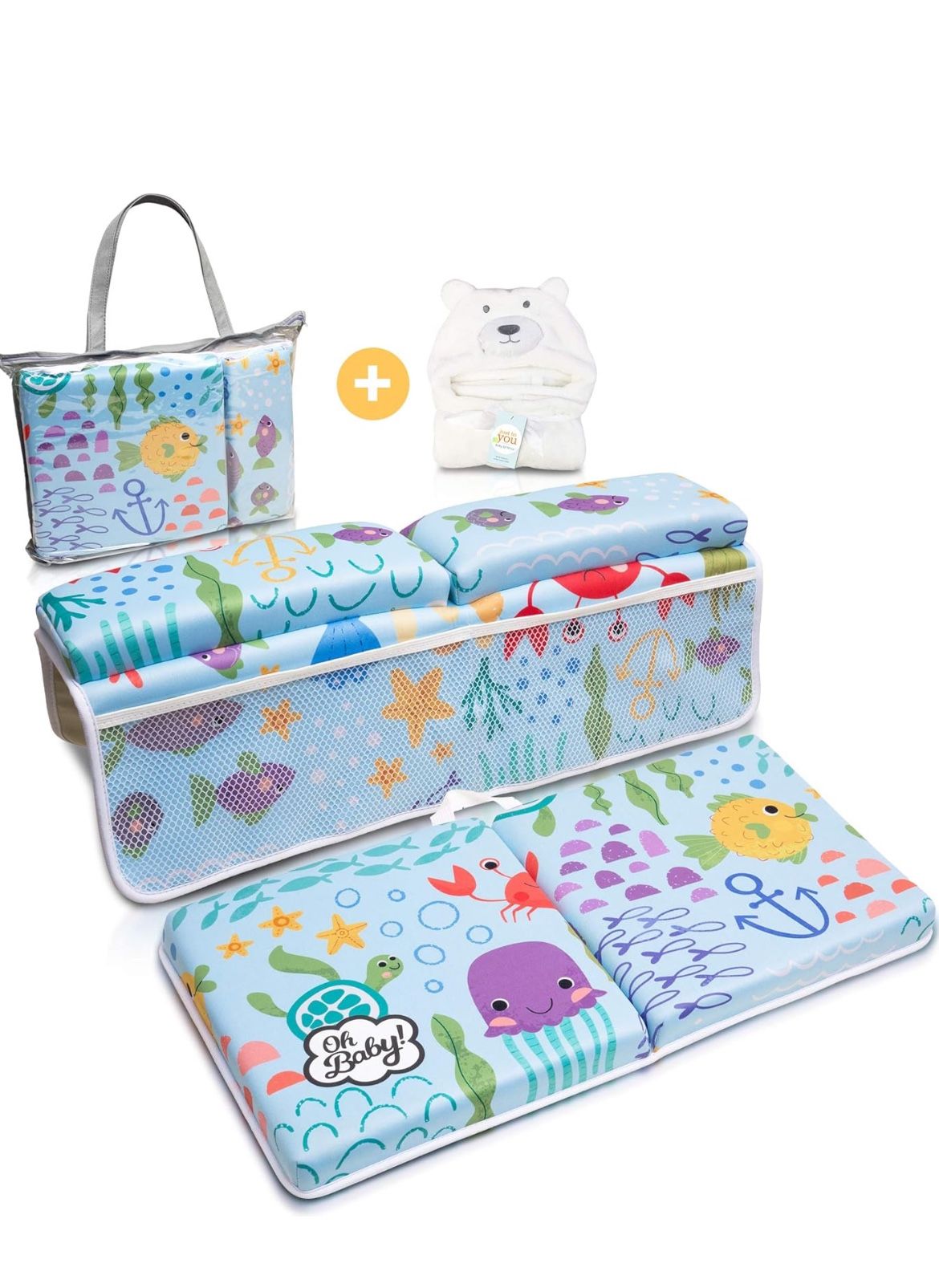 Bath Kneeler and Elbow Rest Pad Set - Includes Hooded Baby Towel, Baby Bath Cushion with 1.5" Neoprene Padding, 8 Suction Cups - Bath Tub Kneeler and Elbow Rest, 4 Mesh Pockets for Bath Essentials