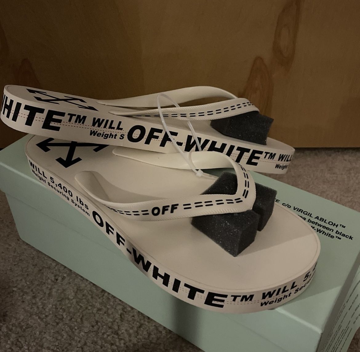Brand new asking $150 Off white flip flops size 9.5 beige color trades for off white, supreme, bape, palace, Travis Scott, kaws, murakami, revenge, etc.