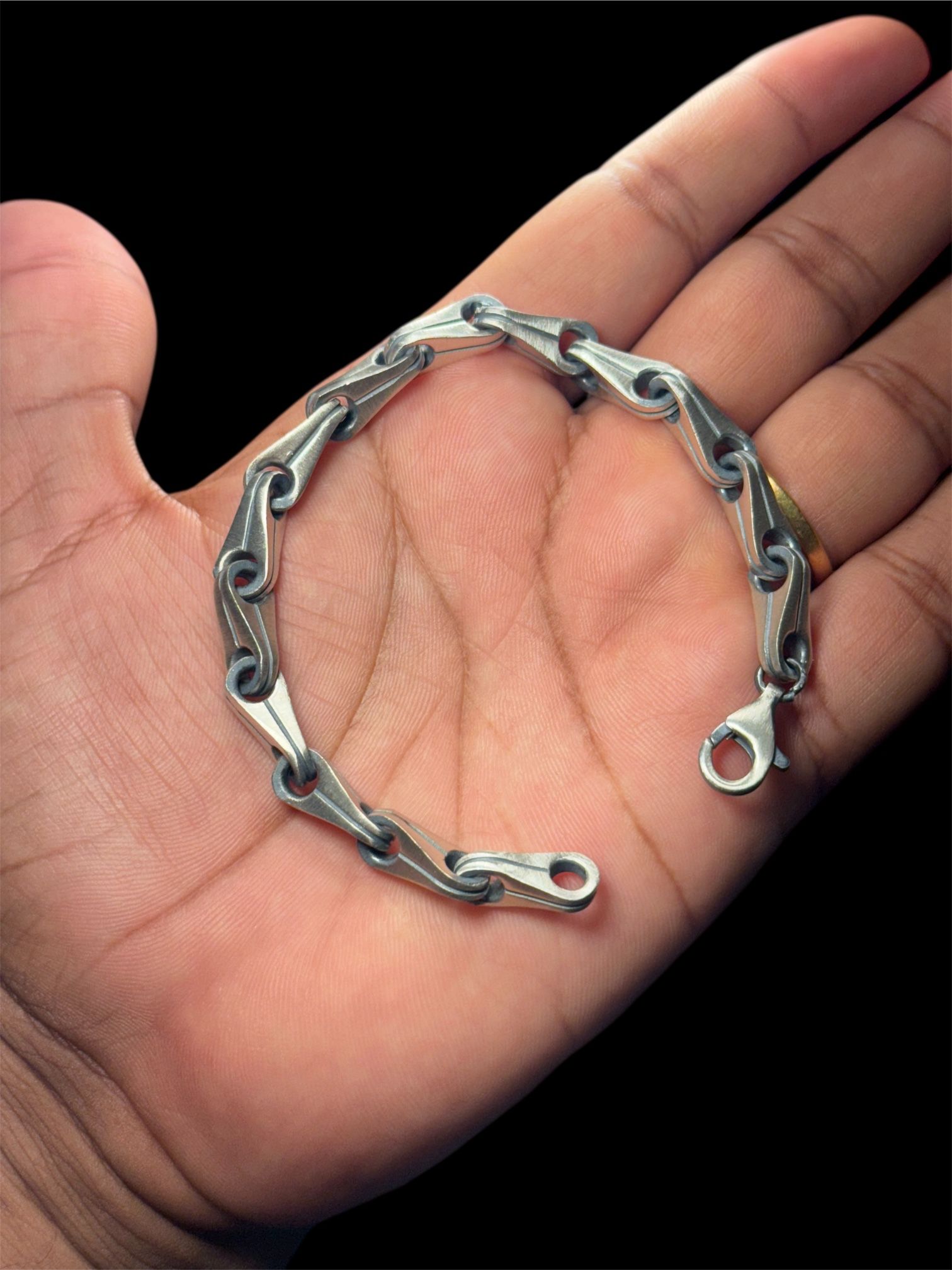This handmade 925 sterling silver bracelet features a bold yet refined chain design with a smooth matte finish that gives it a modern, understated look. Crafted for durability and everyday wear, this piece has a solid feel and timeless appeal. Each link is carefully formed and assembled by hand, resulting in a bracelet that feels substantial on the wrist while remaining comfortable to wear. A perfect unisex piece—ideal for those who appreciate authentic craftsmanship and minimalist silver jewelry. ⸻ Details • Material: Solid 925 Sterling Silver • Length: 8.3 inches (approx.) • Width: 6 mm (approx.) • Weight: 39 grams • Finish: Matte • Style: Chain bracelet • Closure: Secure lobster clasp • Handmade: Yes