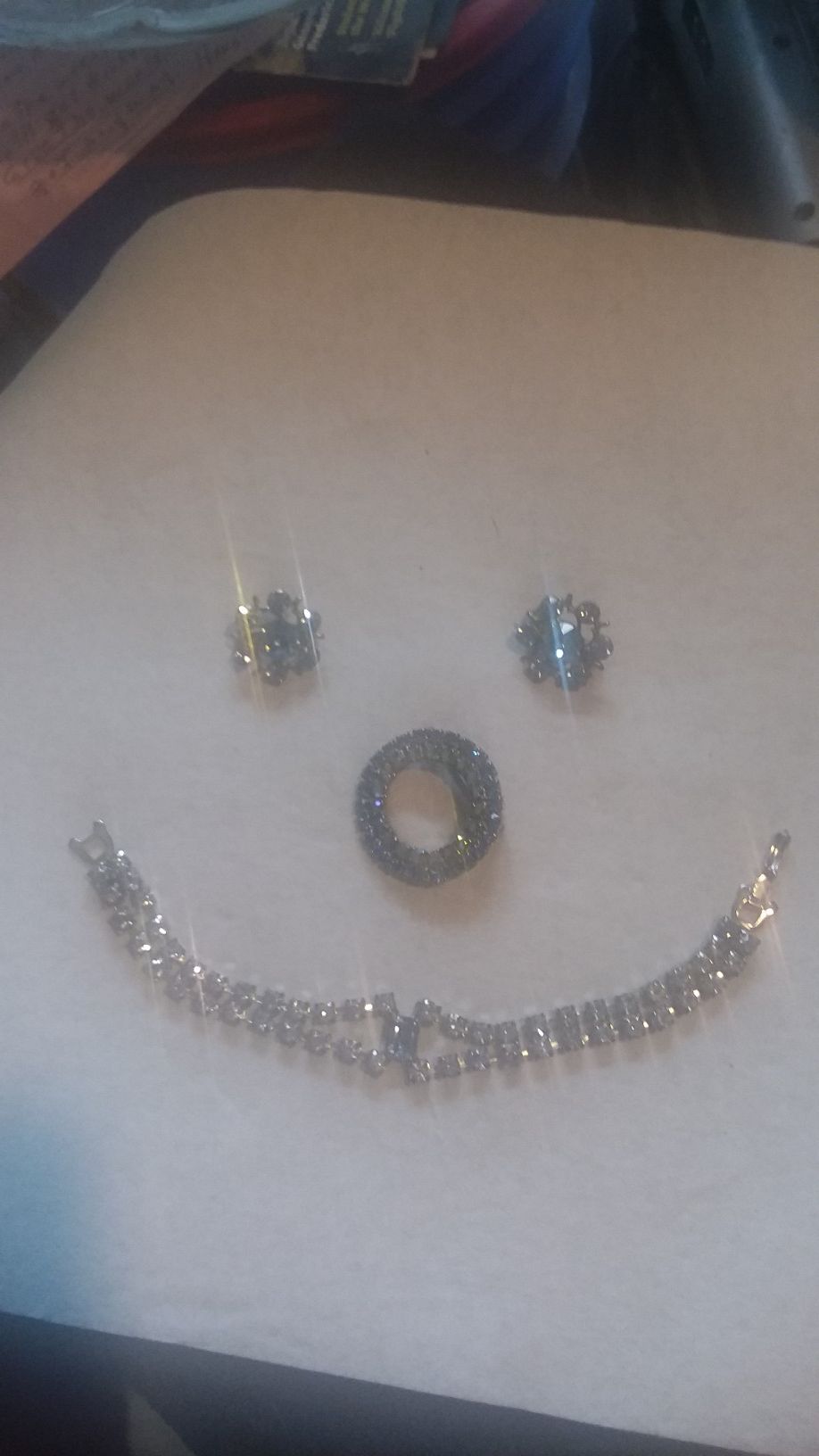 60's era antique rhinestone Bracelet with matching colored Brooch & Earrings very sparkly. please see my other jewelry. Art . Crystal and collectable listing.bracelet is only Antique . Light blue band dark blue centerstone