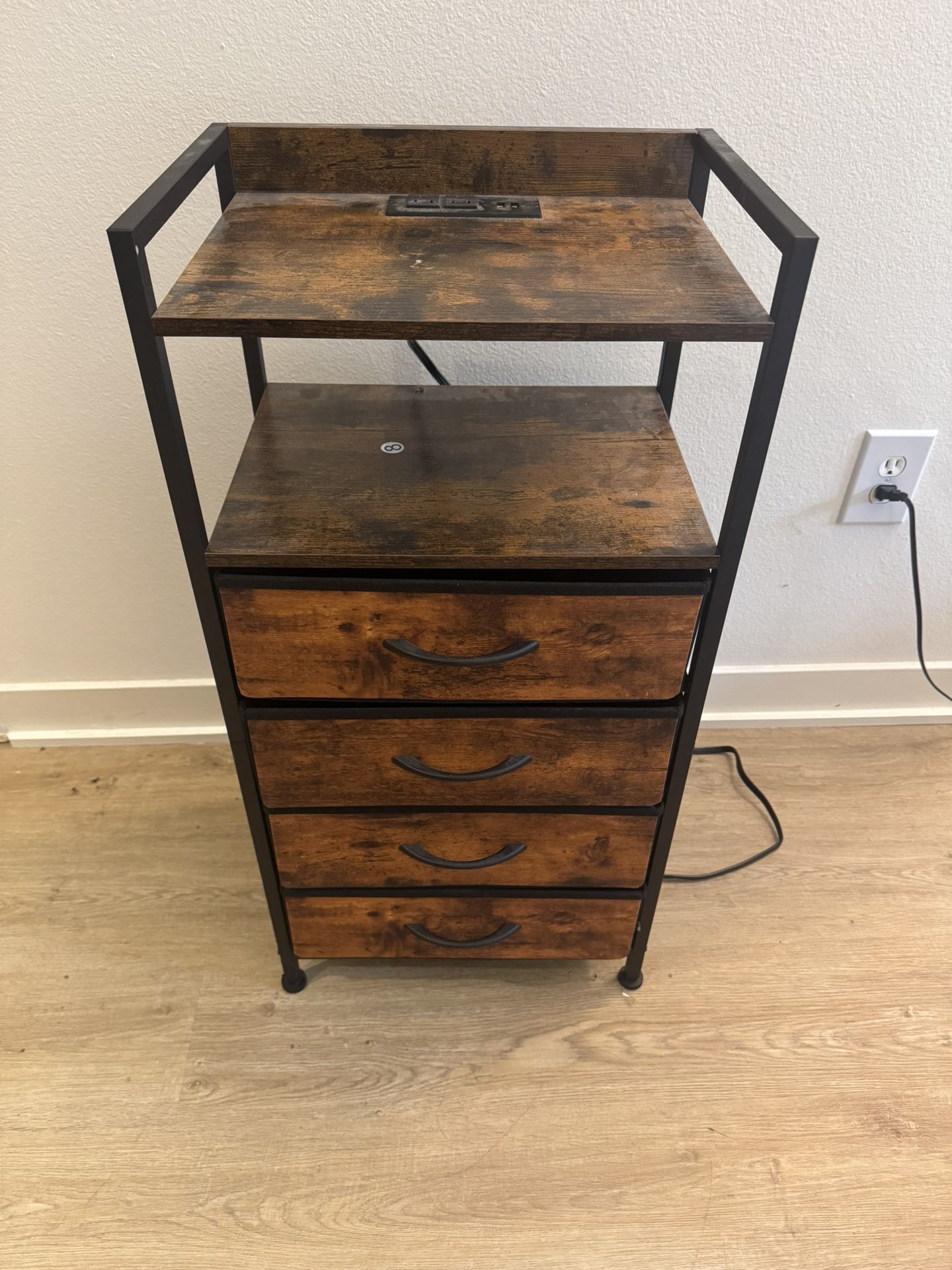 Metal/Wood Small table with usb ports, multiple uses around the house! Four fabric shelves for organization. 16” W x 11” D x 33” H