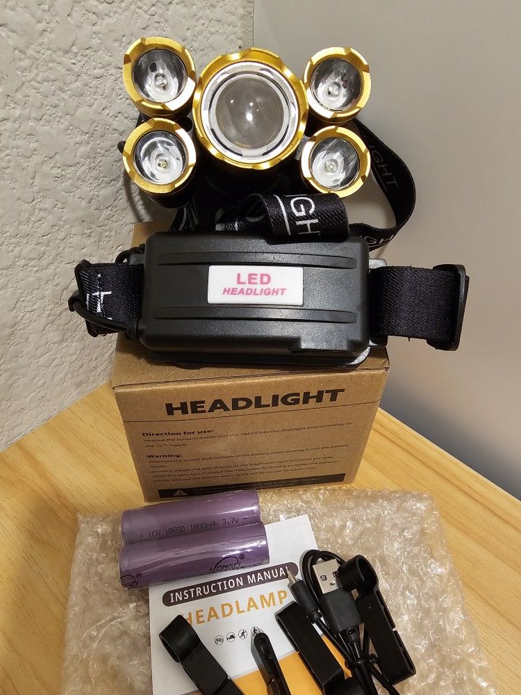 Brand new. Price is Firm. Headlamp, High Lumen Ultra Bright 5 LED Head Light, USB Rechargeable Waterproof Headlight Flashlight with Zoomable, 4 Modes Head Lamp for Outdoor Camping Hiking Fishing Hunting The rechargeable headlamp flashlight consists of 5 LED bulbs and a red Back Warning Light with a maximum brightness of 12,000 lumens and a range of 600 meters illumination.