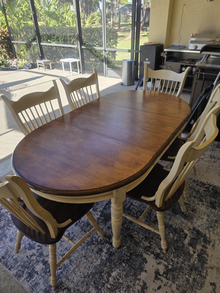 Solid wood dining table and 6 chairs. Table is 75" x 42" . 2 leafs are 12 inch each so Table can be 51" x 42". Excellent condition