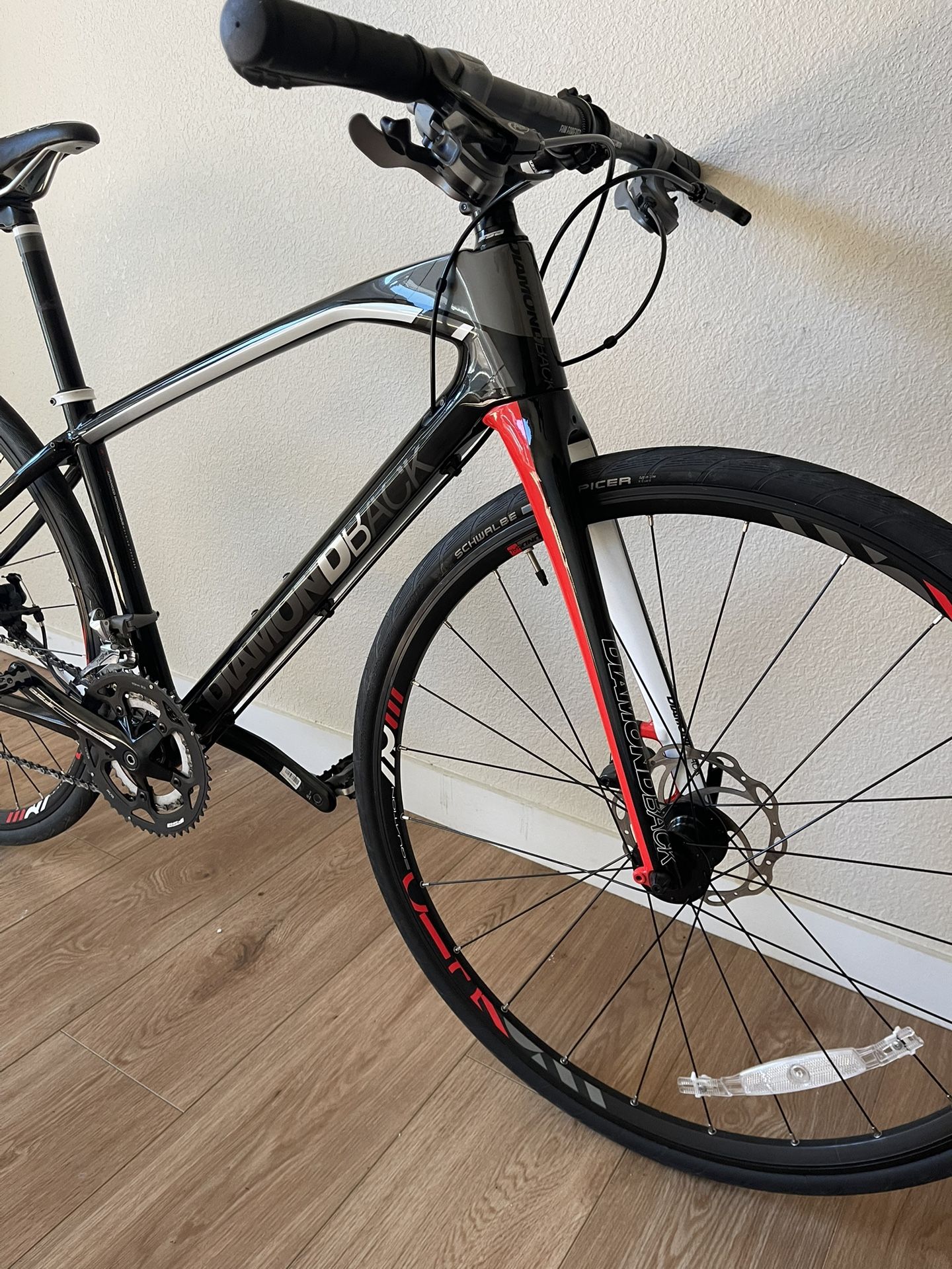 Frame: High-performance, full carbon fiber for vibration damping and responsiveness. Handlebars: Equipped with flat handlebars for a more upright riding position compared to traditional road bikes. Components: Typically built with a blend of Shimano and SRAM components, often featuring Shimano Tiagra trigger shifters and hydraulic disc brakes. Usage: Designed as a versatile commuter or fitness bike, blending the speed of a road bike with the durability of a mountain bike Braking: Features mechanical or hydraulic disc brakes (such as Avid or Shimano) for consistent stopping power in various weather conditions. Geometry: Utilizes Diamondback’s Performance Hybrid Geometry, which offers a more upright and comfortable riding position compared to a standard drop-bar road bike while remaining efficient. Wheelset: 700c wheels paired with relatively slim tires designed for speed on paved surfaces.