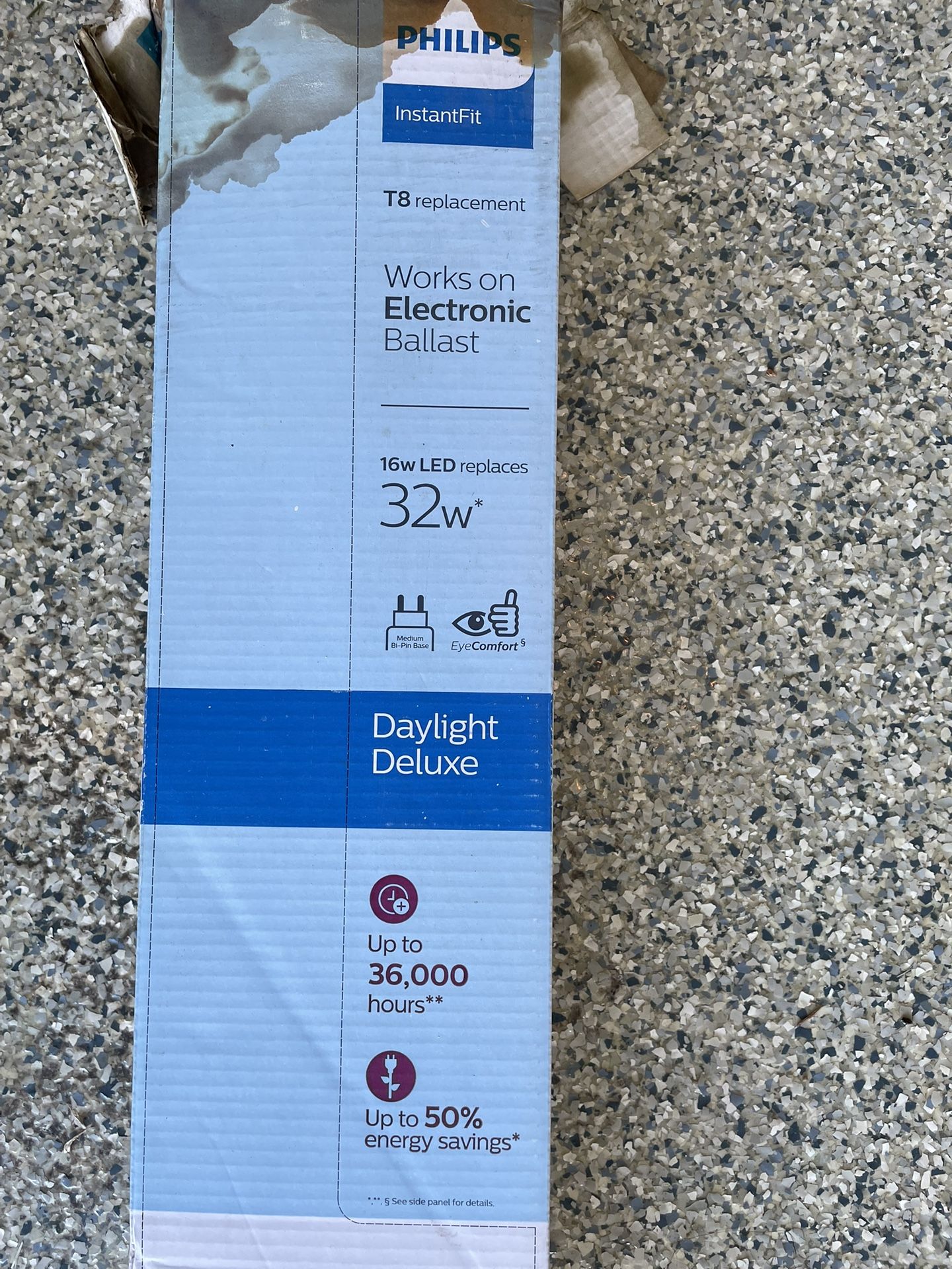 6 Philips InstantFit T8 LED Tube light bulbs 4 ft Some water damage to the box all new bulbs