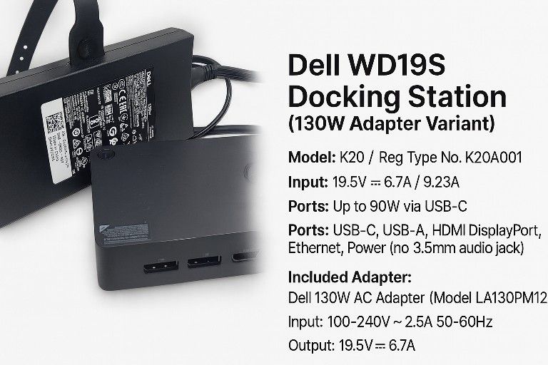 Dell WD19S Docking Station (130W Adapter Variant) Model: K20A / Reg Type No. K20A001 Input: 19.5V ⎓ 6.7A / 9.23A Power Delivery: Up to 90W via USB-C Ports: USB-C, USB-A, HDMI, Dual DisplayPort, Ethernet, Power (no 3.5 mm audio jack) Made in Vietnam Included Adapter: Dell 130W AC Adapter (Model LA130PM121) Input: 100–240V ~ 2.5A 50–60Hz Output: 19.5V ⎓ 6.7A Made in China Fully compatible and tested setup. Ideal for expanding laptop connectivity to multiple displays and peripherals.