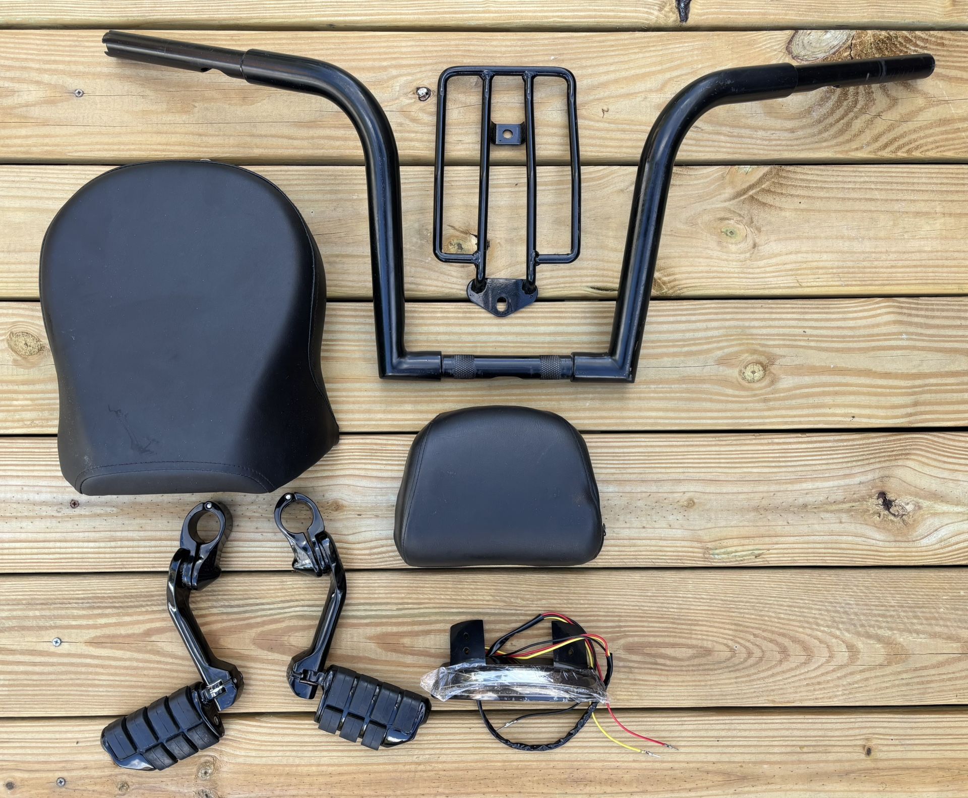 Harley Sportster rear seat. 12” Handle Bars. Rear sissy bar cushion. Highway pegs black. Harley Sportster rear 6 pack rack. Smoked out rear fender LED light. All in like new condition.