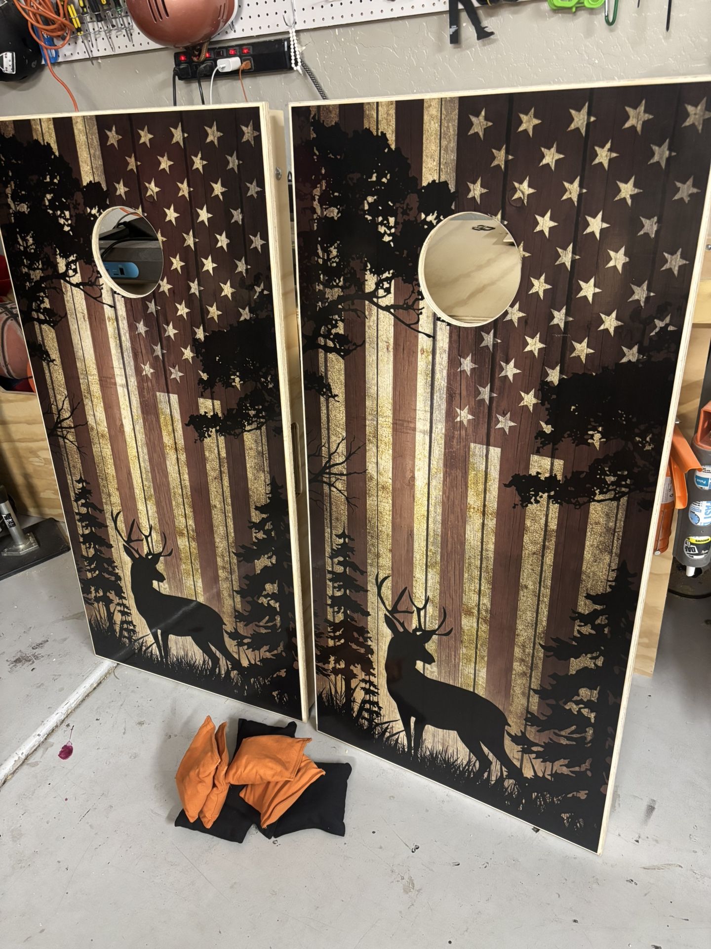 Handmade Wrapped Cornhole Boards – Rustic Flag & Deer Design