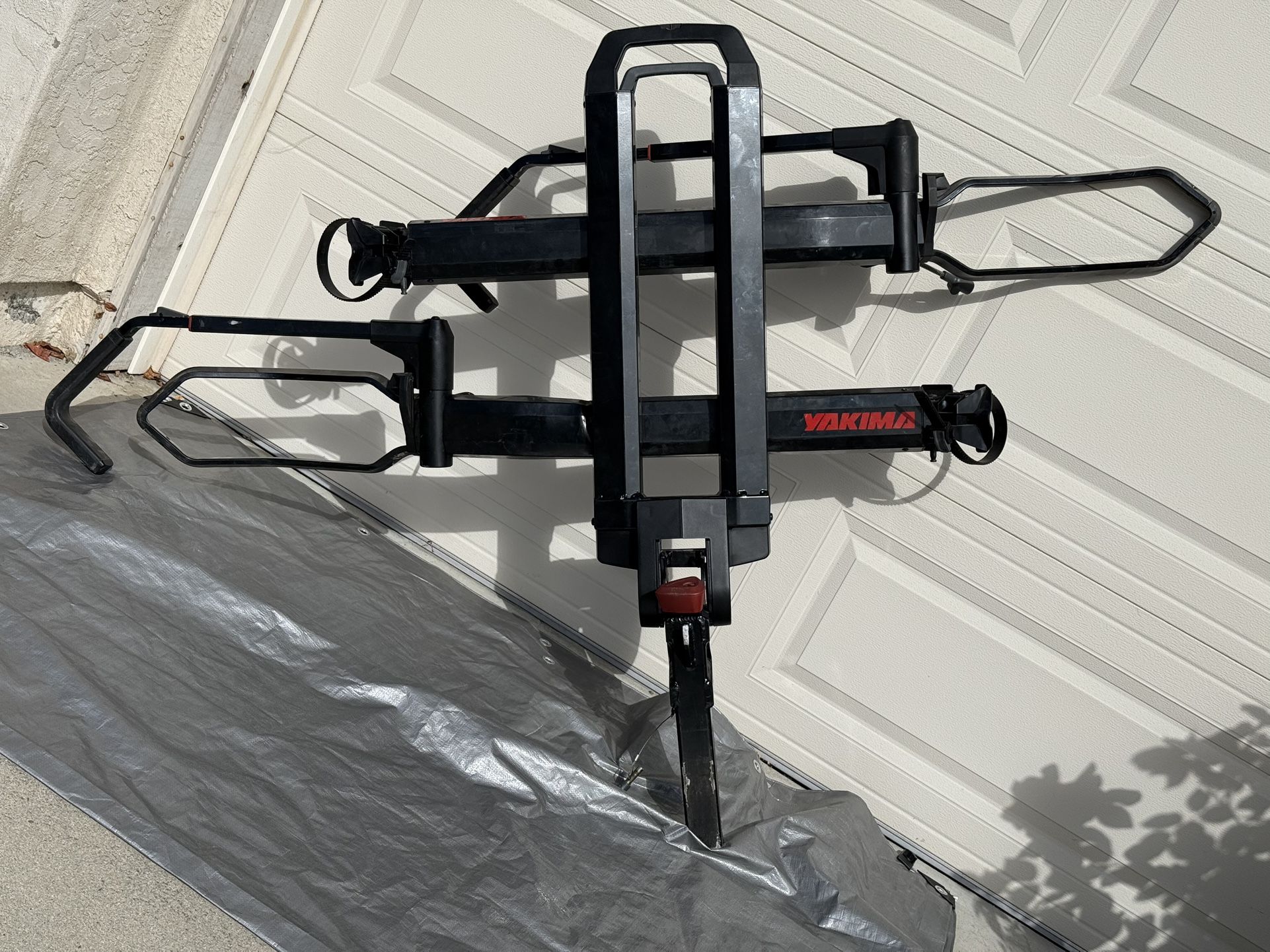 Item in San Diego 92126 Mira Mesa. Lightweight bicycle rack for two (2) bikes fits 2” hitch, has keys to lock secure bikes to rack, and secure rack to hitch. Can be used with road, mountain, and fat bikes with 5-in tires. The trays can slide side to side for a better fit. Rack has a quick lock and anti-wobble system and has built in bottle opener. One tray for rear bike is dented a bit but all works.