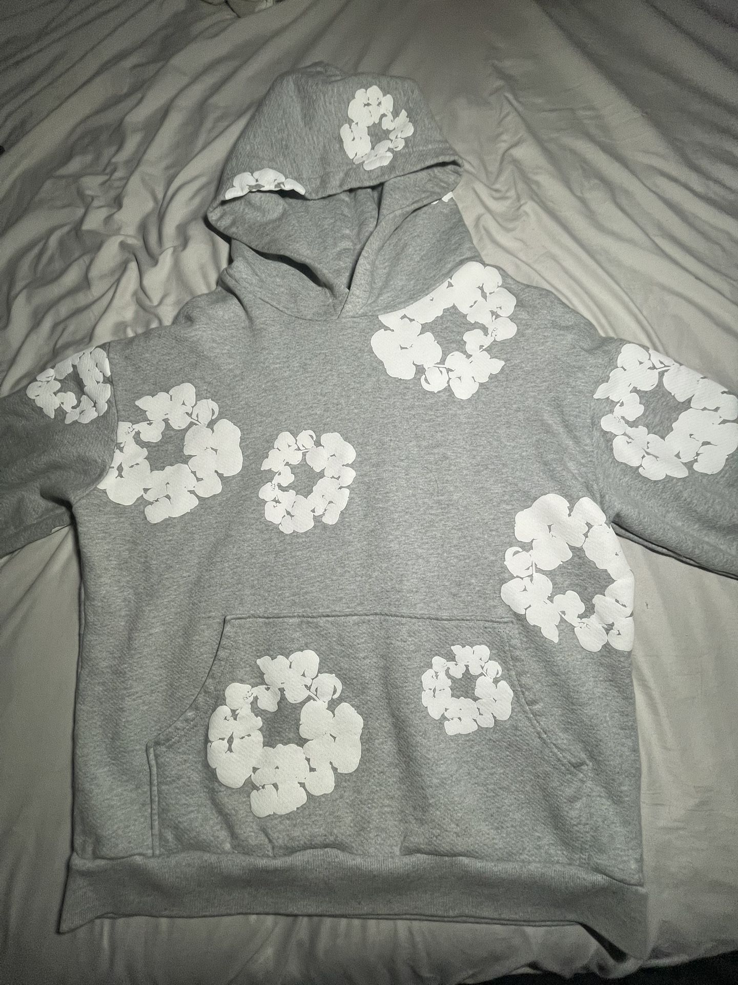 This demin hoodie is in good condition but doesn’t have the bag it’s real and legit you guys can feel it and it’s a size small but feels like a medium but all tho it’s a good hoodie