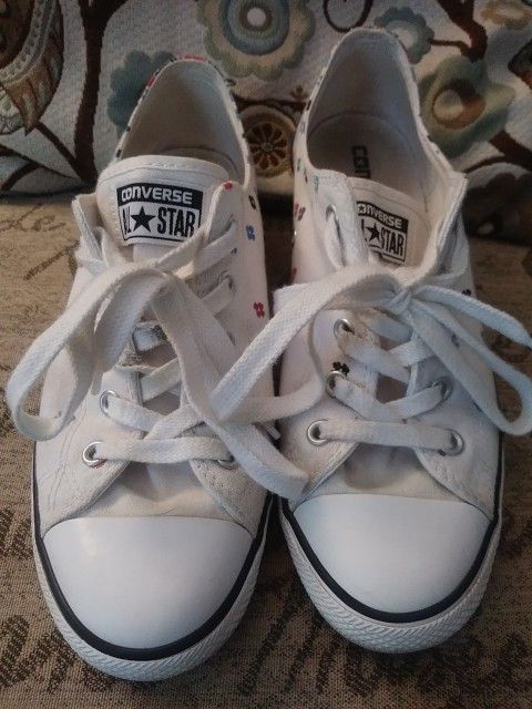 Women's Size 8. Converse Low Tops White w/little Flowers. Supet Cute! Excellent condition.