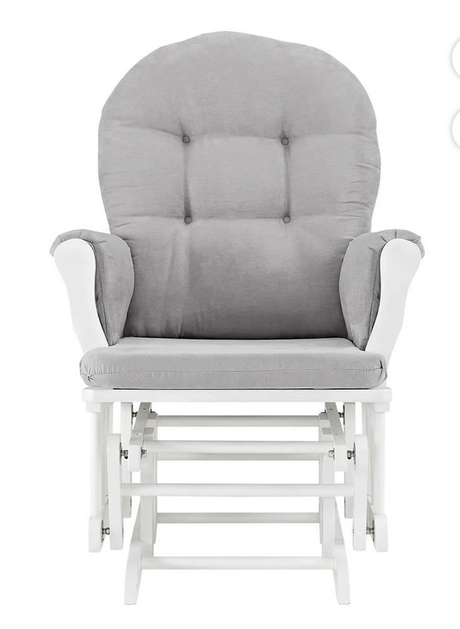 smooth gliding motion ; Removable chair cushions for spot cleaning Nursery glider and ottoman in white with gray cushions