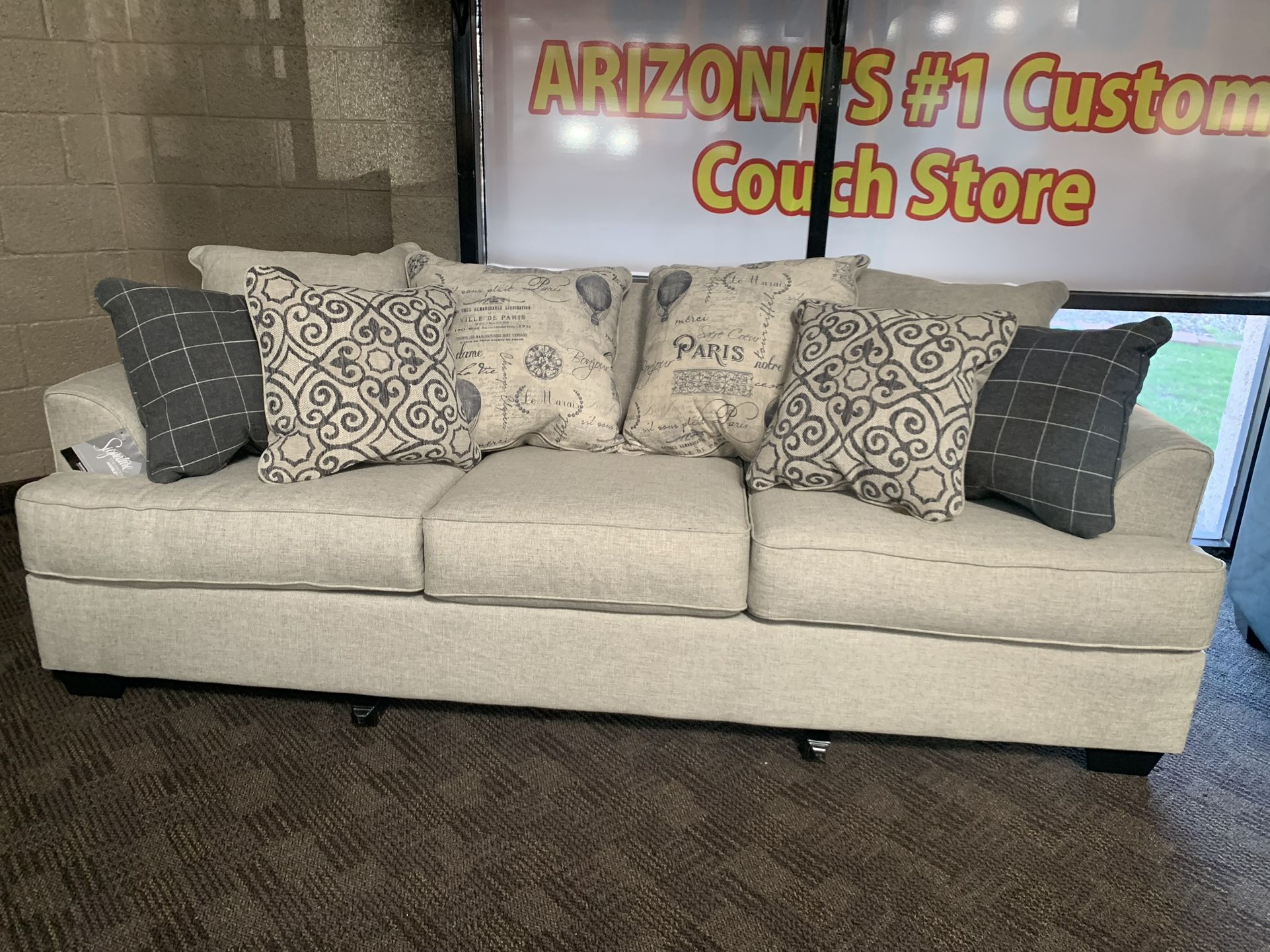 Gorgeous new sofa set. Creamy grey, linen like chenille fabric. Very nice! All pillows included. Brand new! Delivery and payment plans available