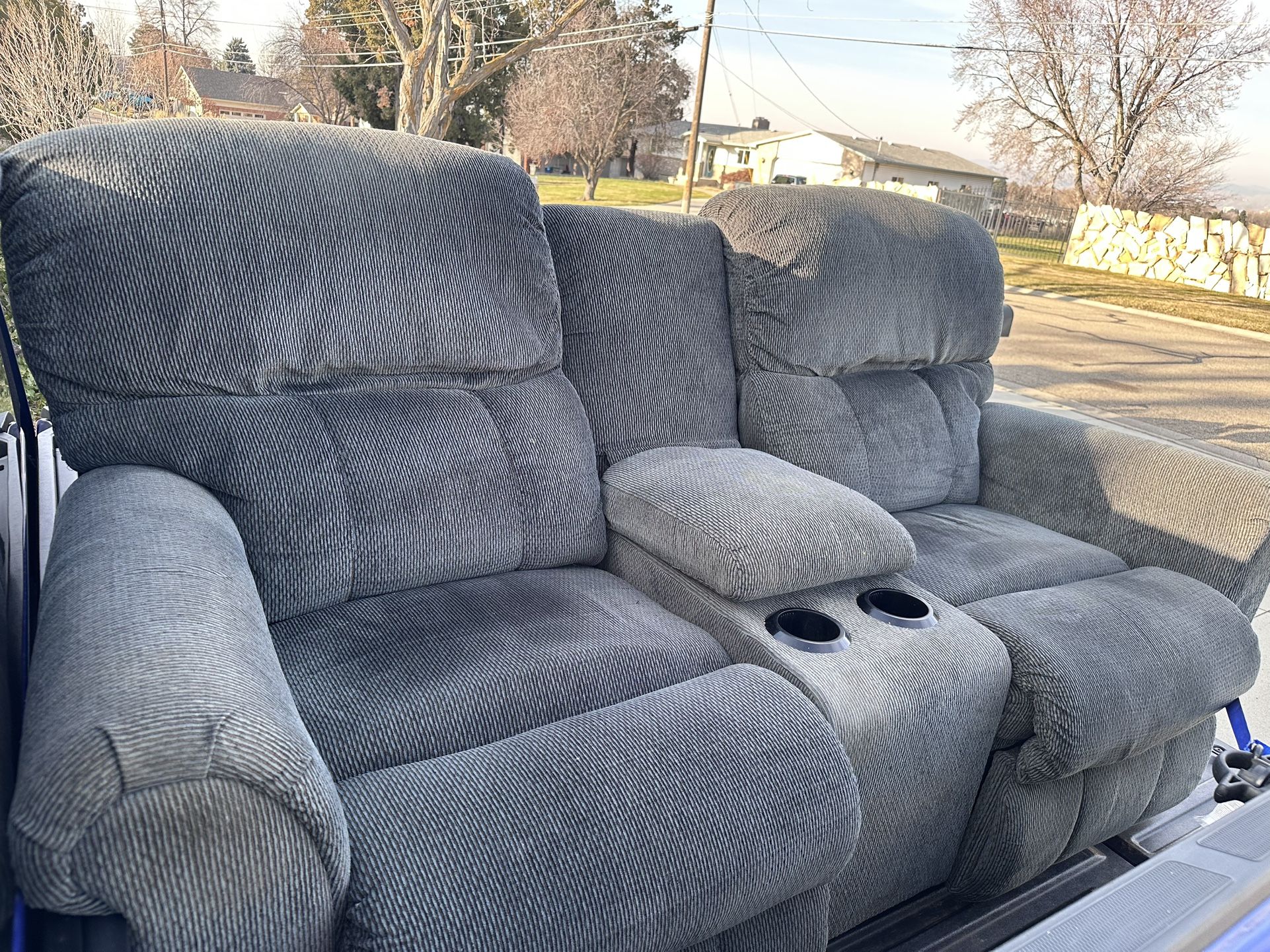 78” wide. Smoke free home. Normal food stains, can be cleaned easily. Our house has pets, but no urine or pet stains. Left side recliner latch is broken. The cable is still there. It had broken before and I used a small vise grip to recline. I used it like that for years then got it repaired three years ago, and it broke again last week. It does still recline using a vice grip attached to the cable. The pictures show the small metal piece at end of cable. Free delivery to BSU, downtown Boise. I will not remove it from the bed of the truck. Have your crew ready. It is not too heavy. Two people can get it moved around. Fits through doorways at an angle. Going up and down stairs might need more than two people. Free!!!!