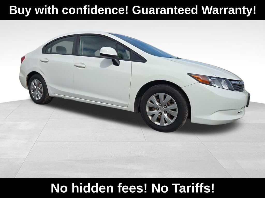 White 2012 Honda Civic LX FWD 5-Speed Automatic 1.8L I4 SOHC 16V i-VTEC Gray Cloth.Recent Arrival! 28/39 City/Highway MPGAwards: * 2012 IIHS Top Safety Pick * 2012 KBB.com Brand Image AwardsKelley Blue Book Brand Image Awards are based on the Brand Watch(tm) study from Kelley Blue Book Market Intelligence. Award calculated among non-luxury shoppers. For more information, visit www.kbb.com. Kelley Blue Book is a registered trademark of Kelley Blue Book Co., Inc.Reviews: * * Engine choices include hybrid and natural gas versions * Excellent fuel economy * Relatively spacious for a compact sedan or coupe * Well-tuned suspension offering comfort with control Source: KBB.com