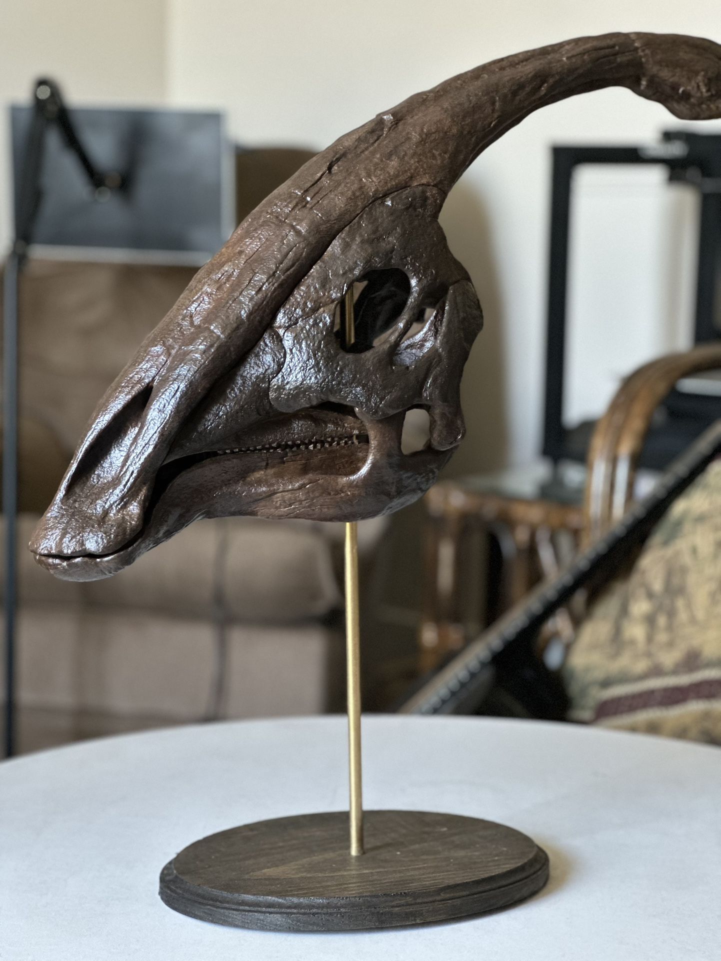 Parasaurolophus skull model with stand This 3d printed model is beautiful and simple, it doesn’t take up much space and is a great table talking point.
