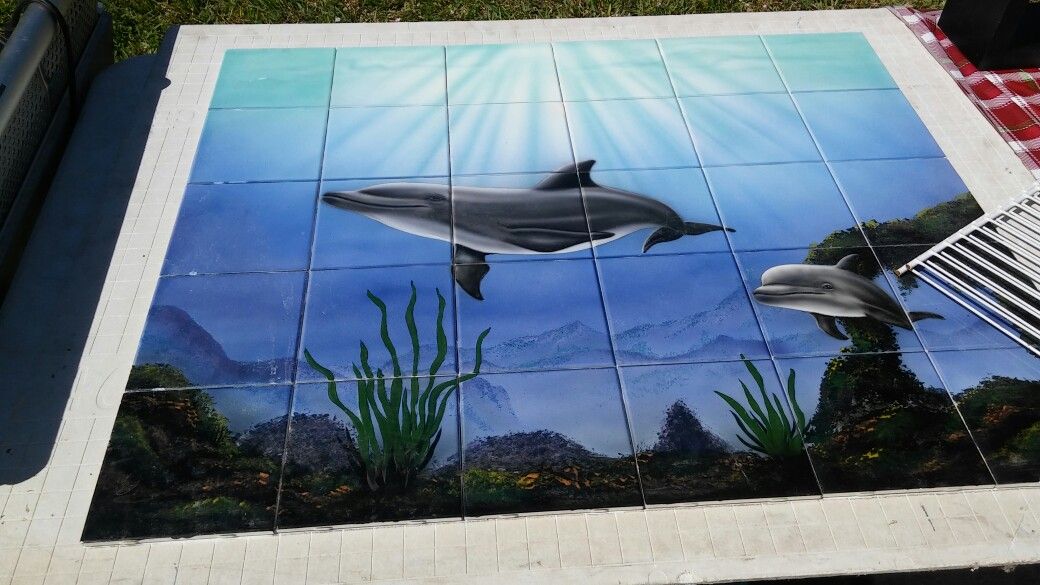 3x3 painted dolphin mural. Deep sea tropical beach Use in your bathroom, pool, or hang anywhere. Mounted on HardiBacker. Vivid colors