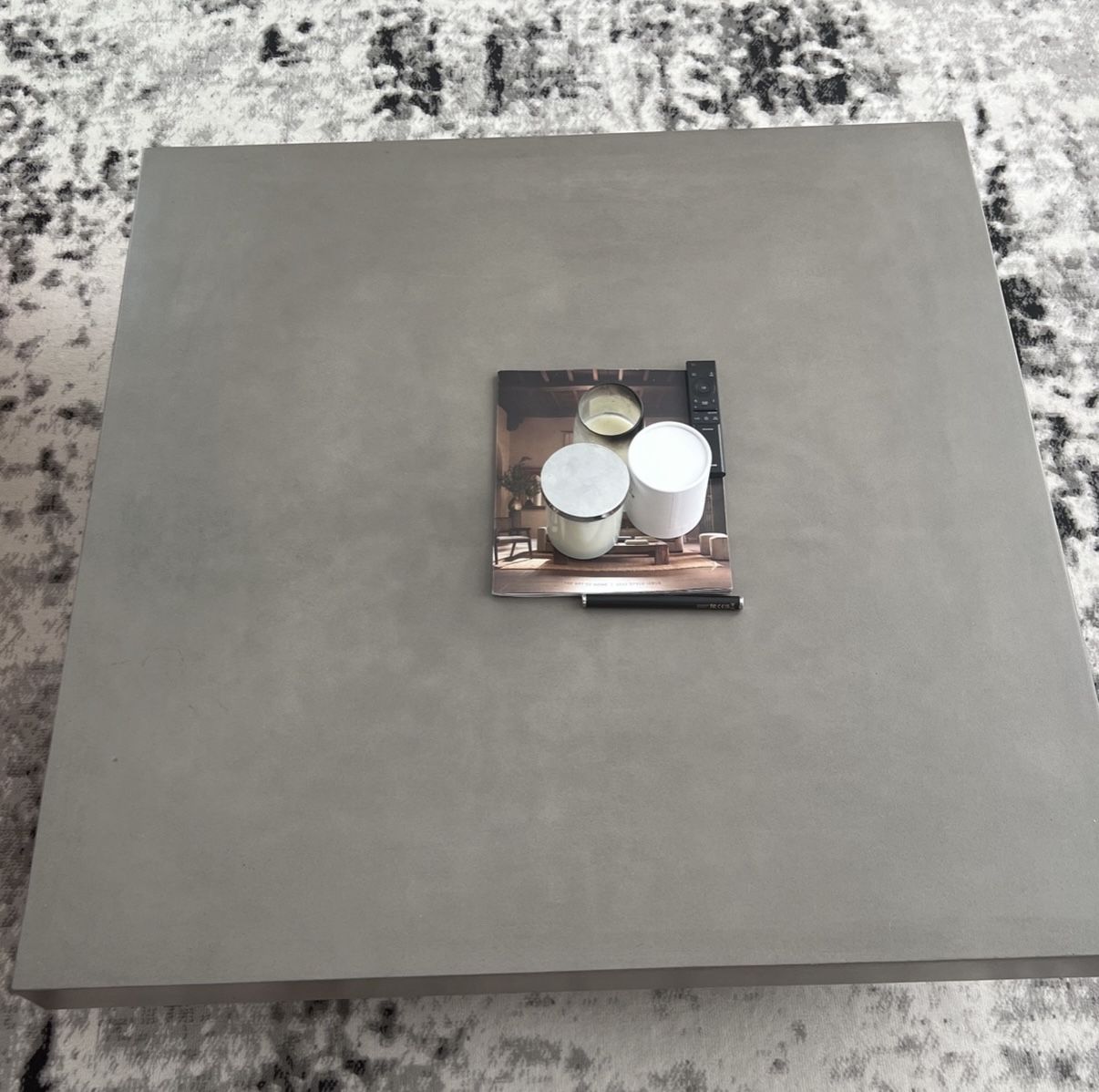 This Wade Logan coffee table is entirely made out of concrete, so it is heavy which makes this table incredibly solid. This is a 2-piece: base and top separated. Base can be lifted with one person. Top should be lifted with two people. Make this a centerpiece for your living room. Guests have always complimented the contemporary style with a sleek/modern finish! Original price: $1200 Overall weight: 225lbs Dimensions: 12" H x 43" L x 43" W