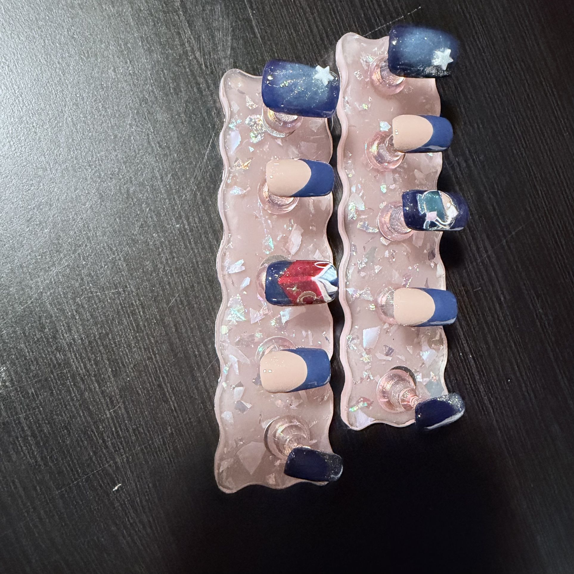 Hello! I am an artist and a beginner nail tech, and have started practicing with press on nails. This is one of the sets I recently did: Sipping tea story time theme. Square short. Medium/small size. Features a cup of tea and a book as well as French tips, all hand printed by me. I also used some cat eye and glitter polish. All gel. Star charms on thumb. (Pink stand sets not included. Press-one only.) Asking $20 OBO.