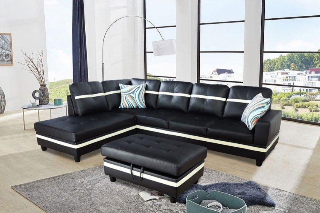 New Black Faux Leather sectional with storage Ottoman and 2 trow pillows at only $700 " FREE LOCAL DELIVERY " Overall Dimensions: 103 x 74 x 35" H Sofa. 71 1/2 x 32 x 35" H Chaise 74 1/2 x 32 x 35" H Ottoman 37 x 24 1/2 x 16 1/2" H